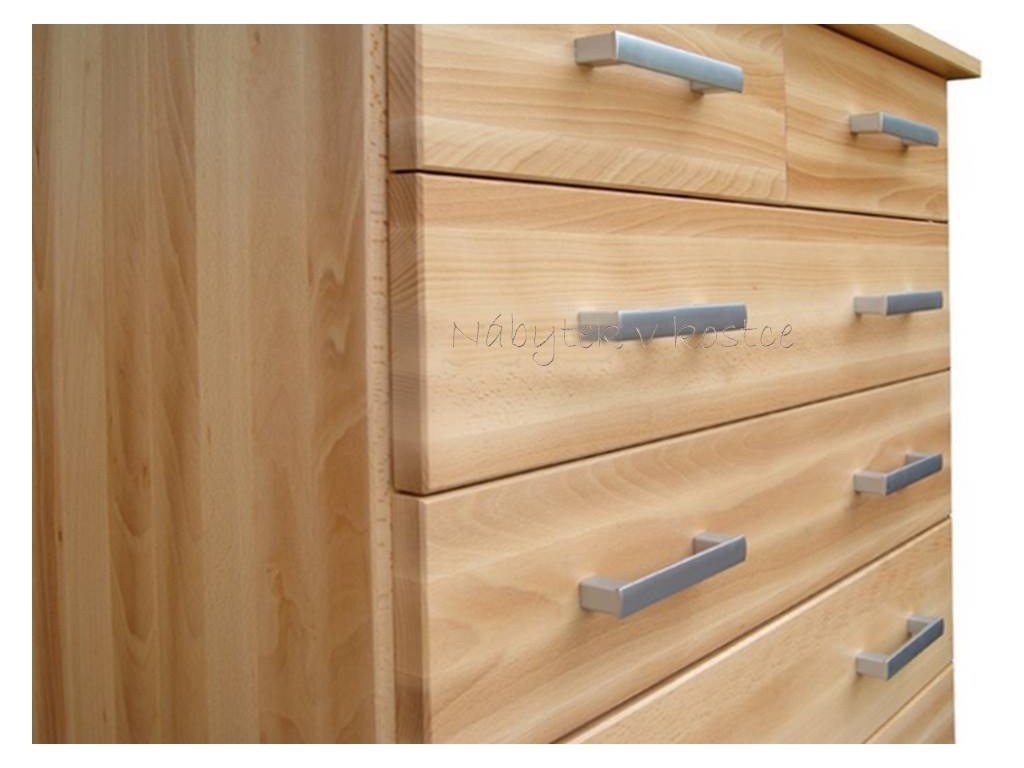 Buková komoda BORA B5 je dizajnová a veľmi elegantná drevená komoda, vyrobená výlučne z kvalitného masívneho bukového dreva (iba zadná časť je zo sololitu). Hrúbka použitého materiálu ho stavia do svetla skutočného luxusu. Zásuvky na výsuvných koľajničkách môžu byť na požiadanie vybavené systémom tichého zatvárania (za príplatok).