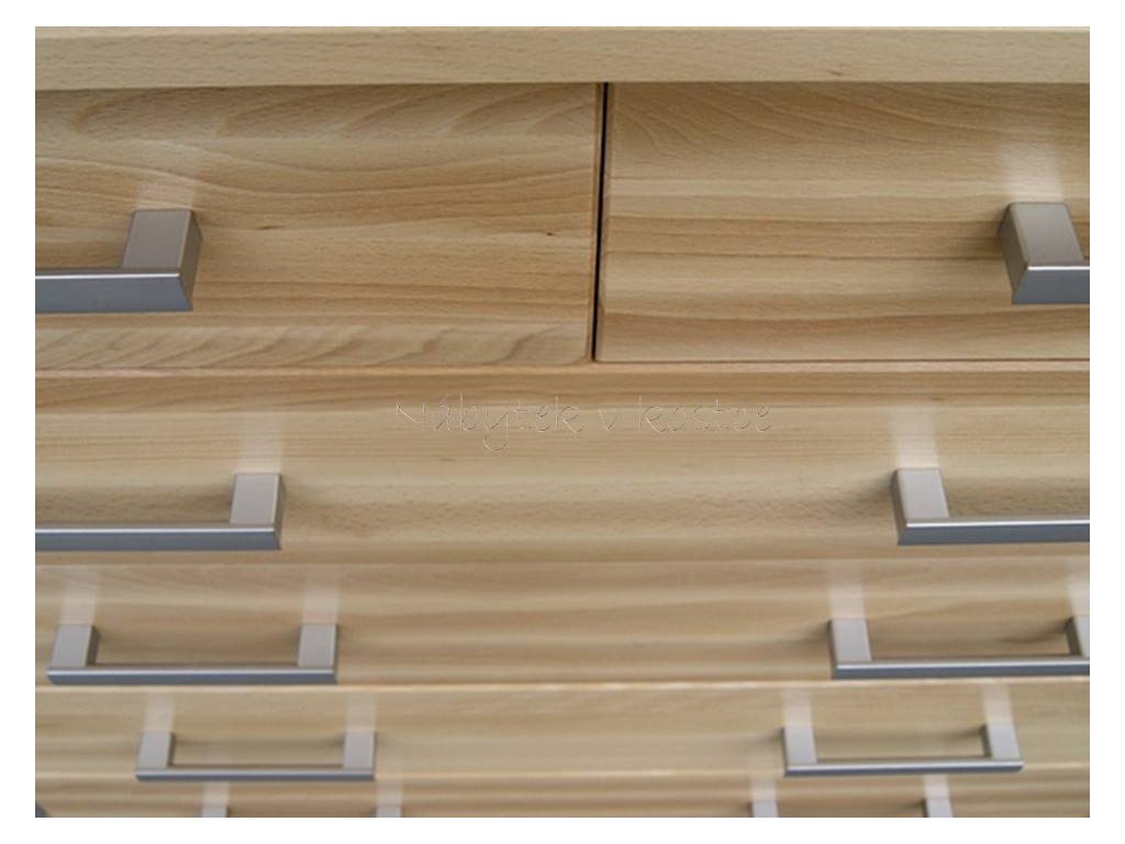 Bukovú komodu BORA B5 dopĺňajú moderné strieborné úchyty.