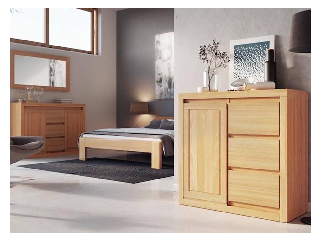 Komoda Naryn z bukového dreva sa skladá zo 4 zásuviek a 1 dvierok. Komoda je vyrobená z prírodného pareného bukového dreva. Použitý materiál je 100% prírodný buk s hrúbkou 18 mm. Dno, boky a vrchná časť sú vystužené s hrúbkou 50 mm. Celodrevené zásuvky sú na kovových ložiskách skrytých zásuviek, čo umožňuje 90 % otváranie. Dvere a zásuvky tejto kolekcie sú vybavené tlmičom dverí. Dvere používajú vysokokvalitné kovové samozatváracie pánty, ktoré umožňujú uhol otvárania až 110°.