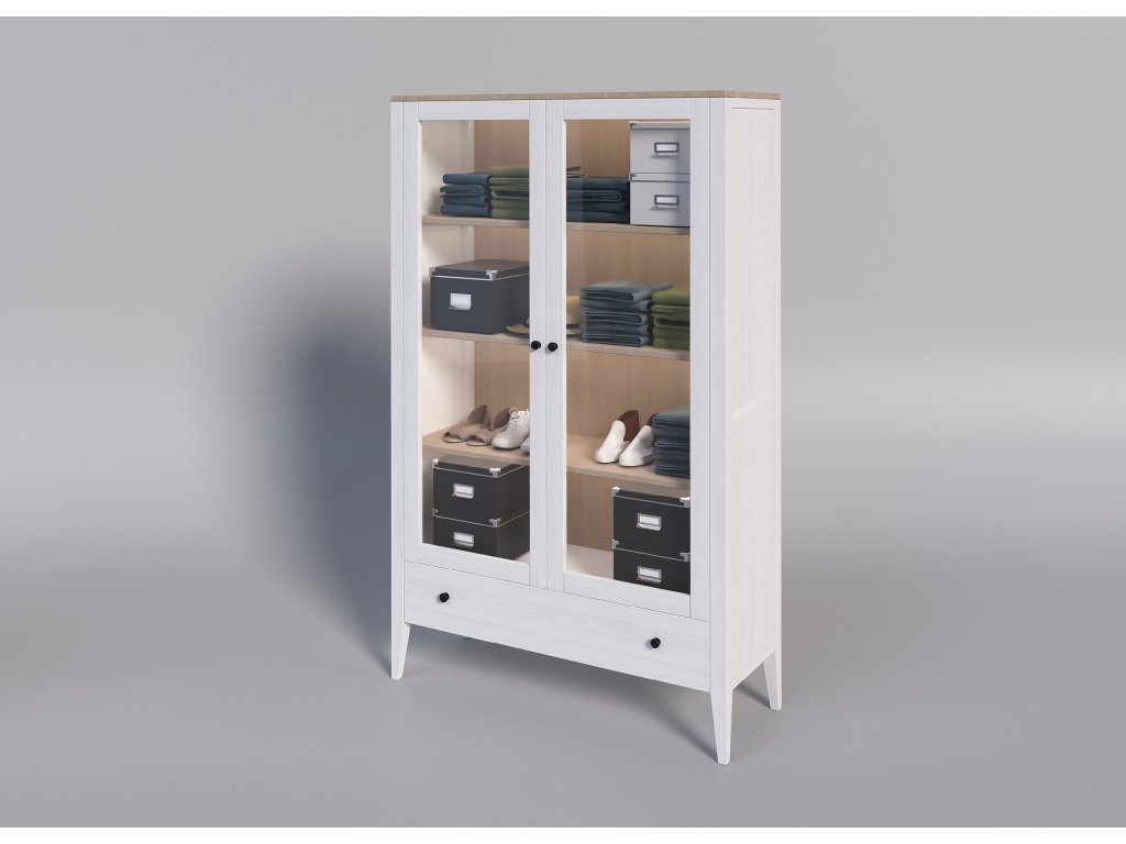 Vitrína z masívu ROMA White je dokončená akrylovými farbami na vodnej báze, ktoré zvýrazňujú jedinečnú štruktúru dreva.