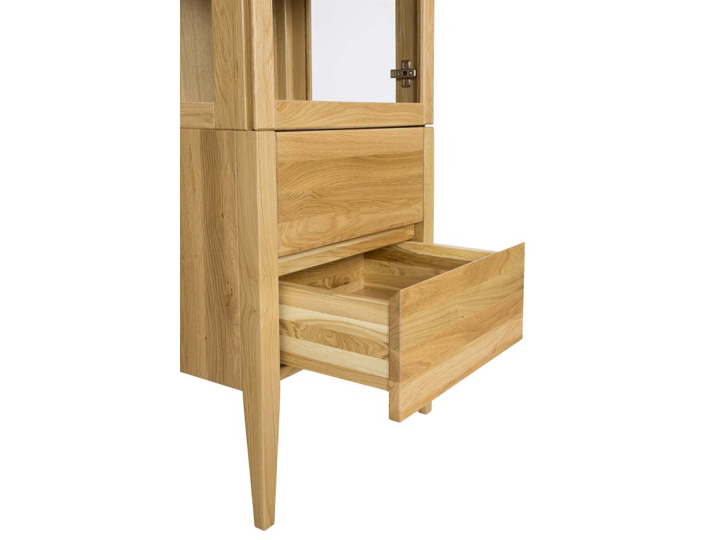 Dubová vitrína OSLO je luxusná vitrína na nožičkách vyrobená z masívneho dubového dreva. Povrch vitríny je ošetrený bezfarebným lakom. Zadná časť komody a dno zásuvky sú vyrobené z MDF.