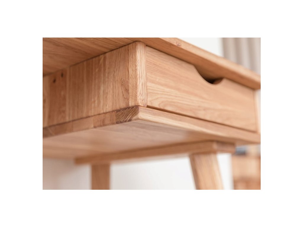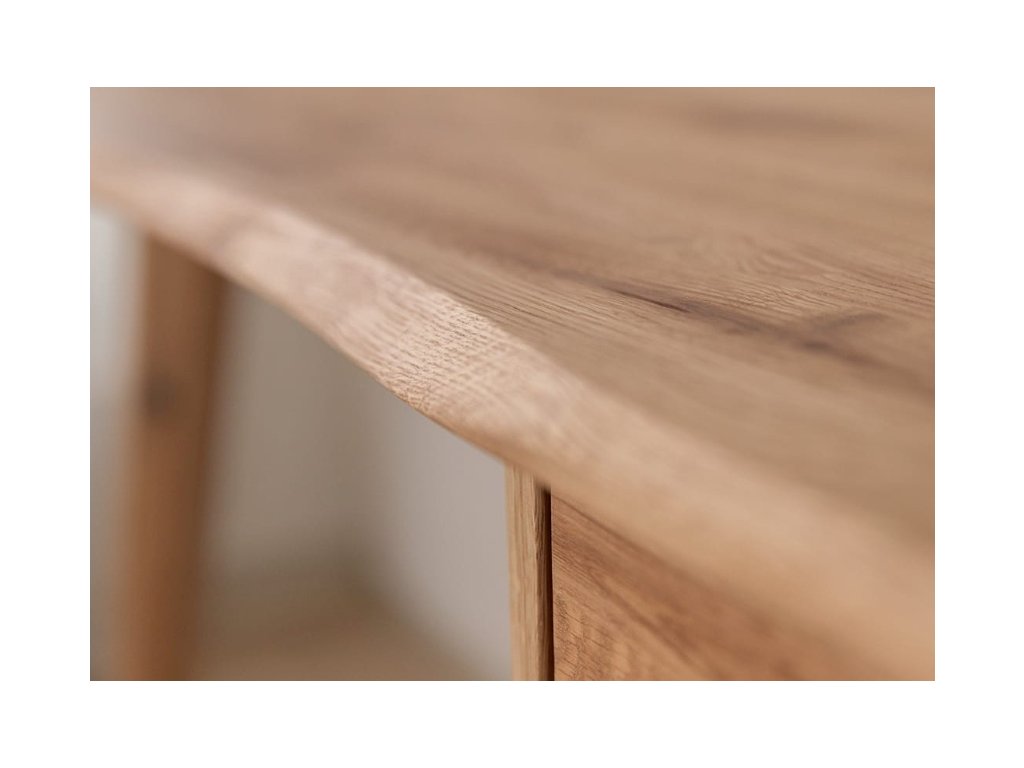 Masívne drevo divokého duba, z ktorého je stôl vyrobený, sa vyznačuje vysokou pevnosťou, trvanlivosťou a odolnosťou voči každodenným hrozbám mechanického poškodenia. Nemusíte sa teda obávať škrabancov ani známok nadmerného používania. Prezentovaný stôl je úplne stabilný vďaka svojej dômyselnej konštrukcii, ktorá zároveň dodáva nábytku vizuálnu ľahkosť.