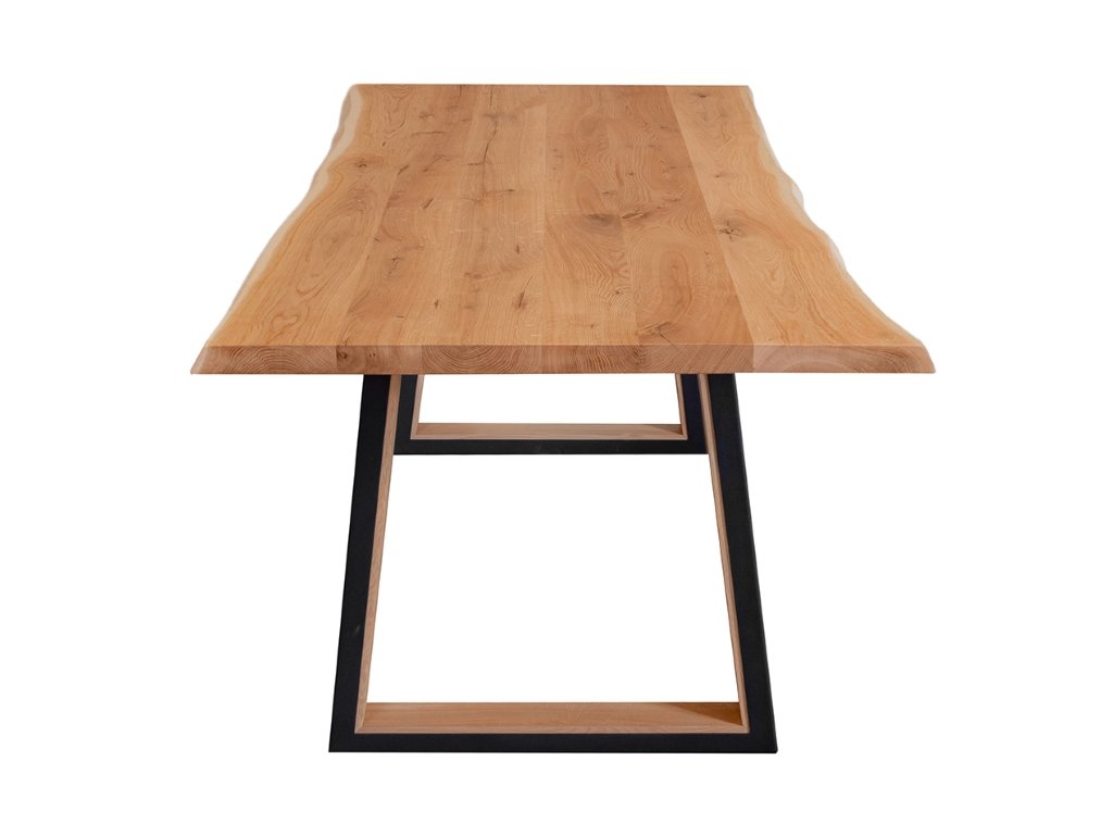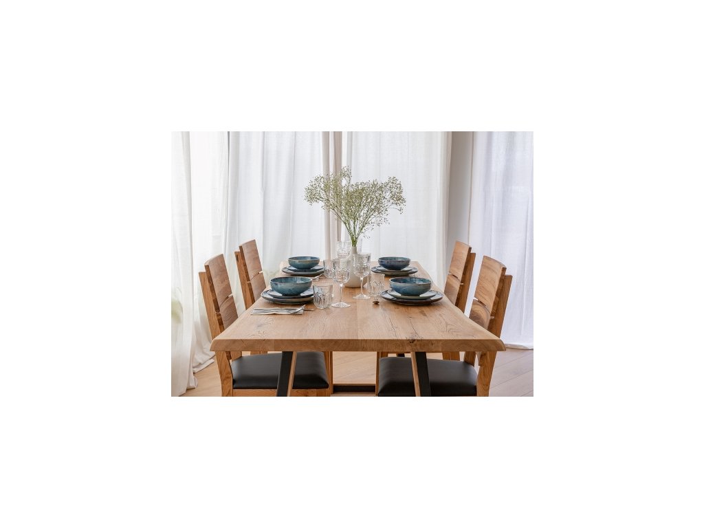 Prezentovaný stôl z masívneho dreva poteší estetickou kombináciou prírodného, teplého odtieňa dubového dreva so sýto čiernou farbou kovových nôh. Veľká stolová doska dodáva pocit pohodlia a komfortu, ktorý podporí príjemnú atmosféru pri rodinných stretnutiach.