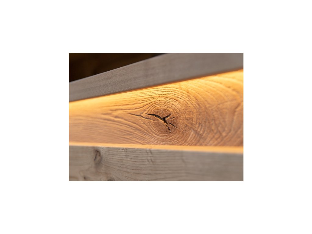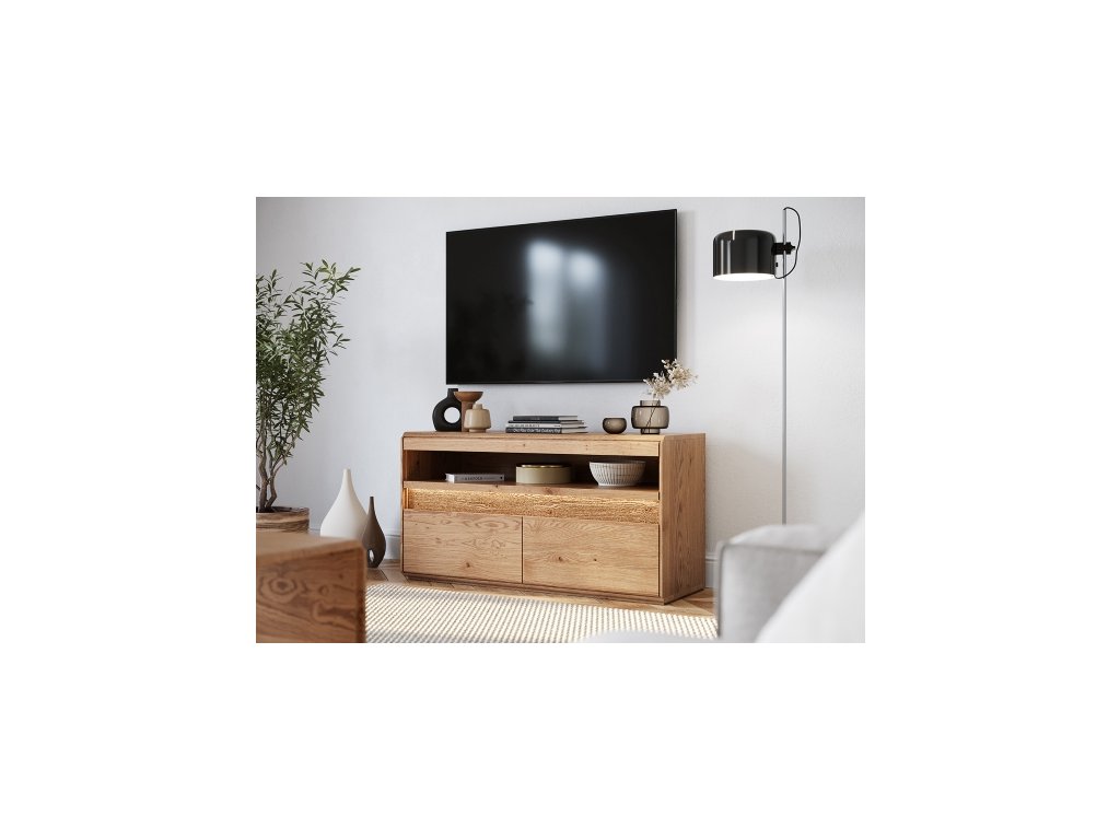 Jednoduché rovné línie sú tu prerušené jemne zaoblenými hranami a mierne zapustenou lištou z brúseného dubového dreva, ktorá je navyše osvetlená zabudovanými LED svetlami, ktoré pomáhajú vytvoriť príjemnú atmosféru a uľahčujú používanie odkladacieho priestoru stola vo večerných hodinách. V hornej časti stola sa nachádza otvorená polica, ktorá je ideálna na umiestnenie set-top boxu, prehrávača alebo hernej konzoly.