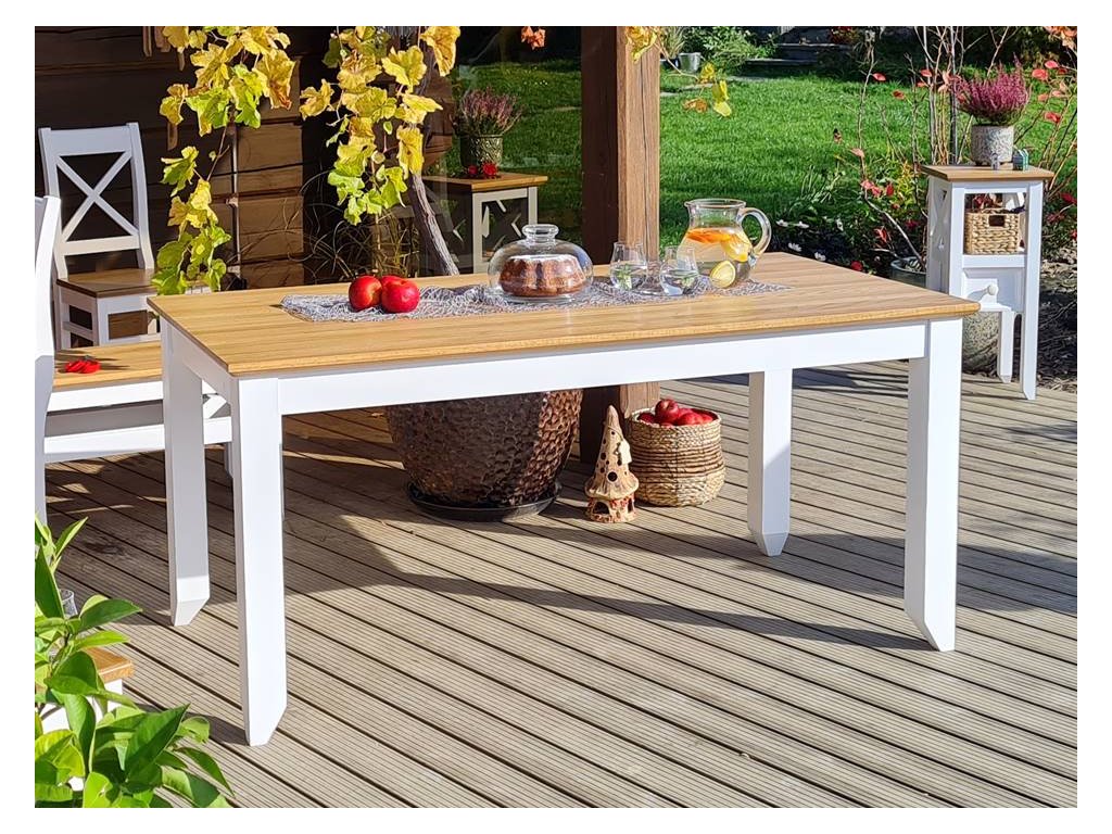 Masívny jedálenský stôl PROVENCE je vyrobený z masívneho bukového dreva a ošetrený akrylovou farbou v bielej alebo sivomodrej farbe. Doska stola je vyrobená z masívneho dubového dreva a ošetrená lakom.