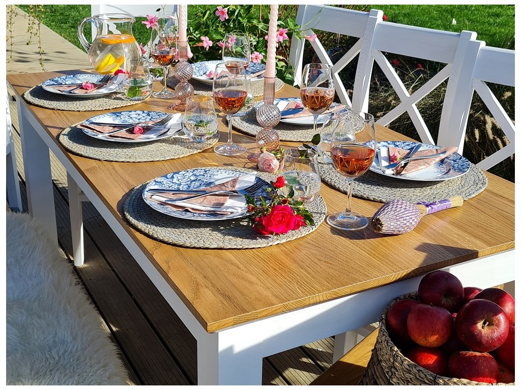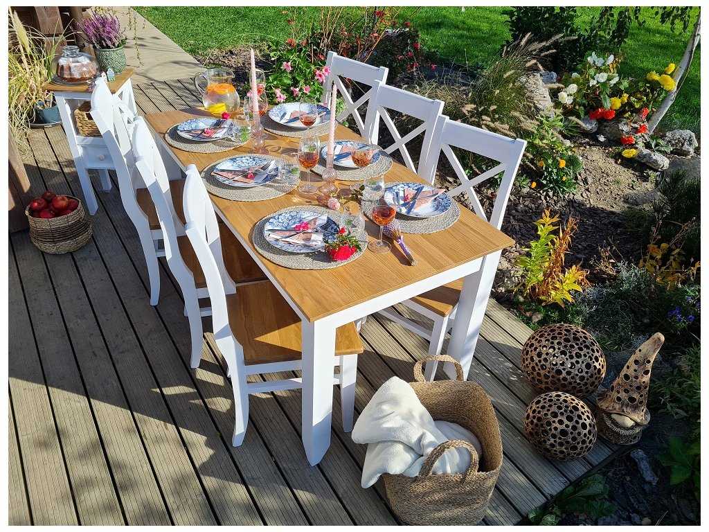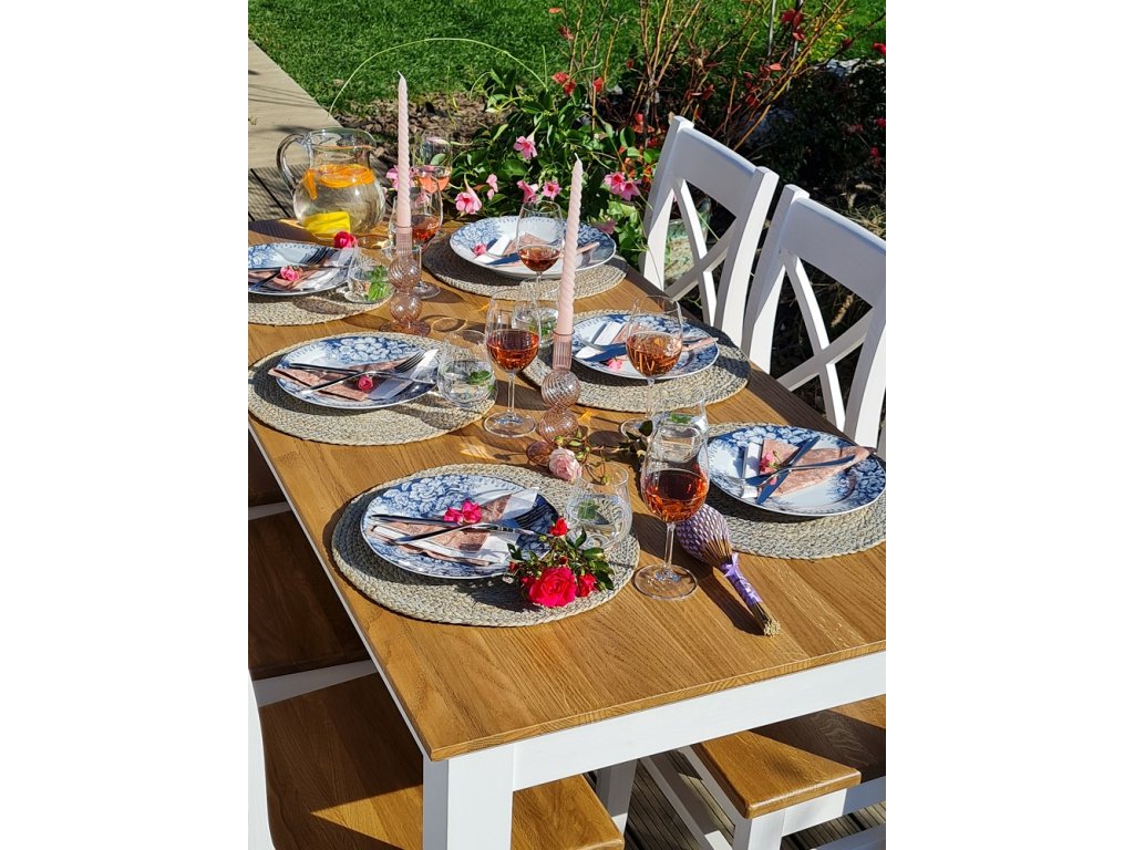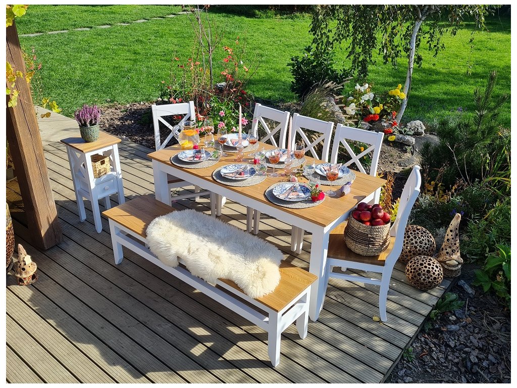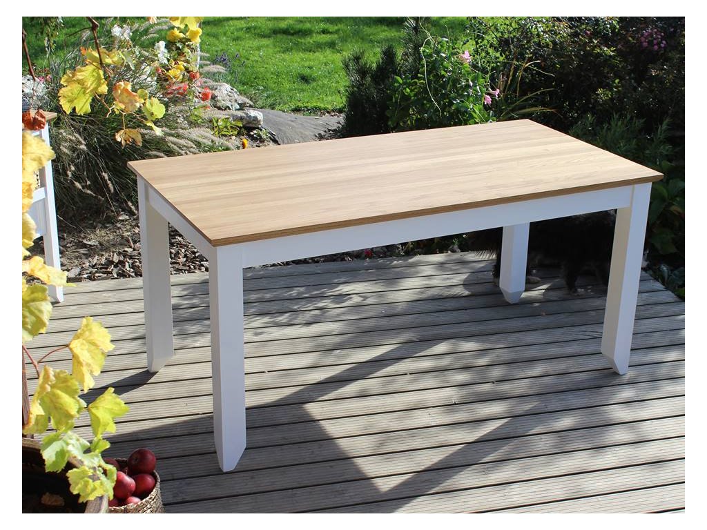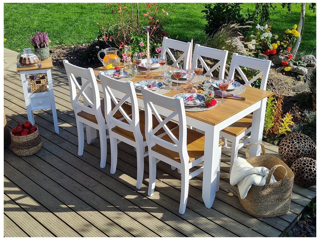 Masívny jedálenský stôl PROVENCE je vyrobený z masívneho bukového dreva a ošetrený bielou akrylovou farbou. Doska stola je vyrobená z masívneho dubového dreva a ošetrená lakom.