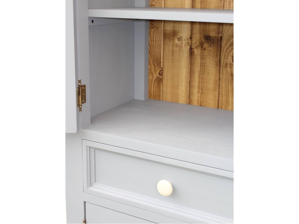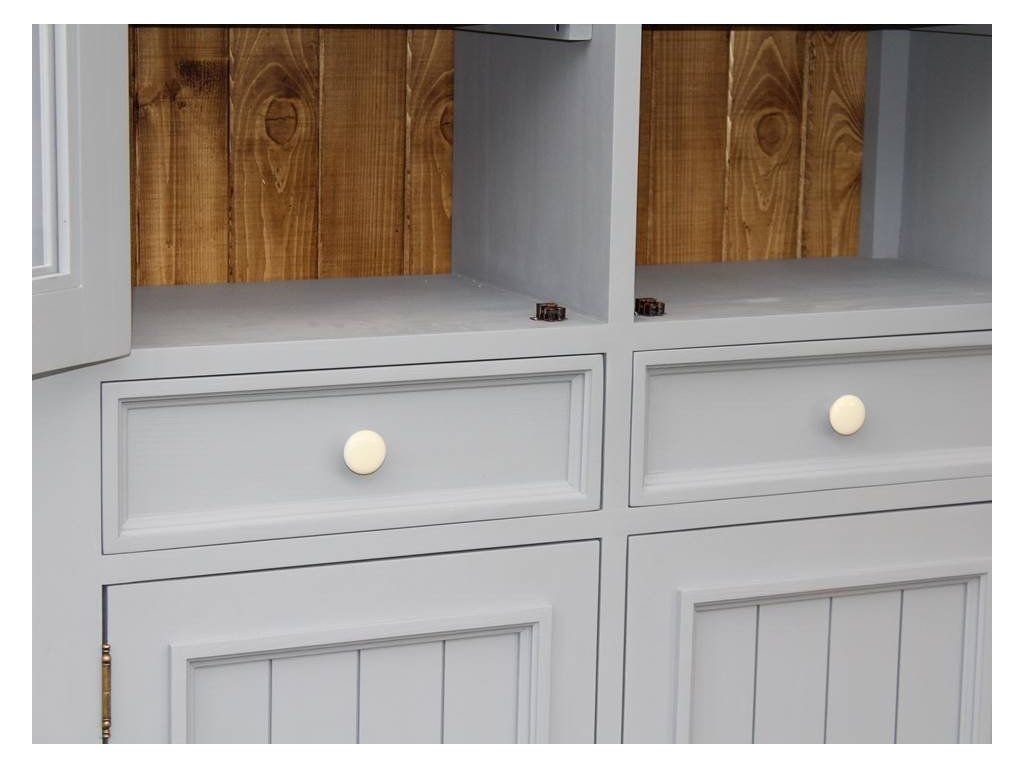 Bukový regál PROVENCE je kombináciou bukového a dubového dreva. Dubové drevo (vrchná doska) je ošetrené lakom a bukové drevo je ošetrené akrylovou farbou sivomodrej farby. Zásuvka je bez bežcov. Možno objednať so systémom tichého zatvárania (pre zásuvky).