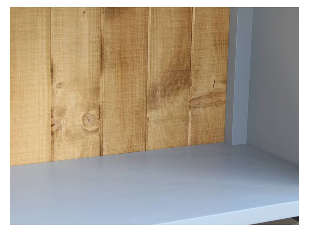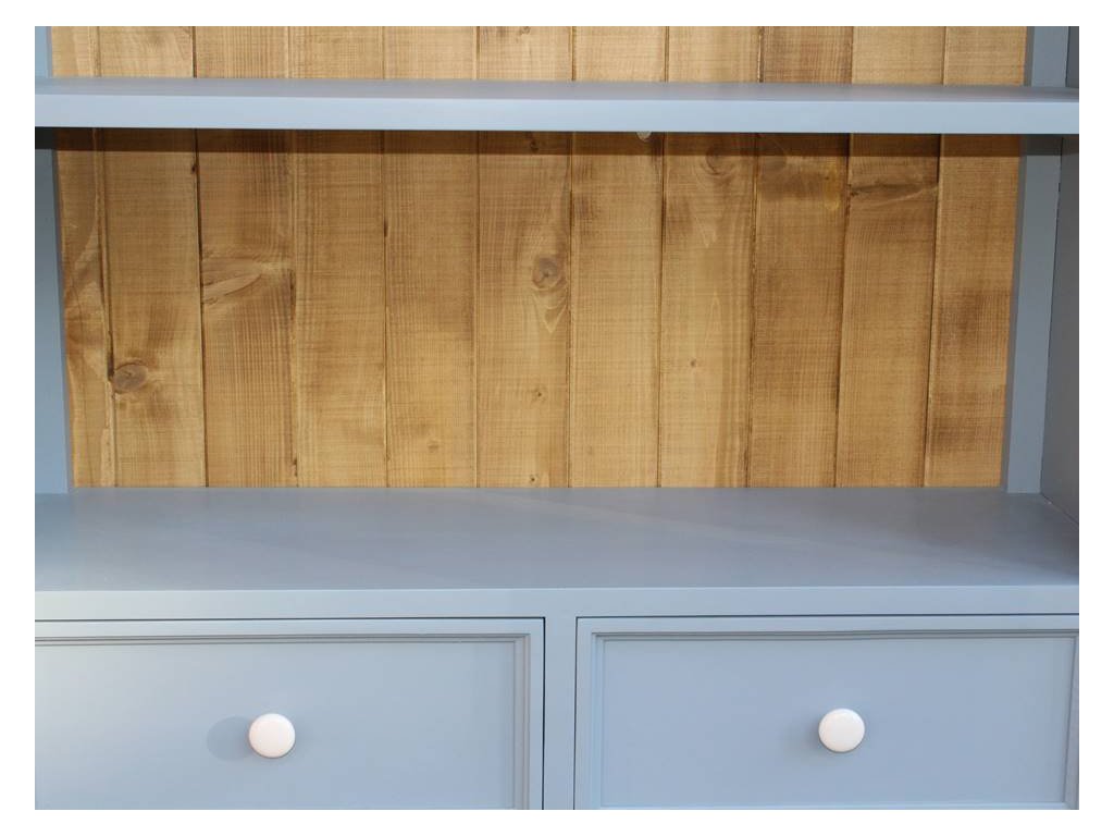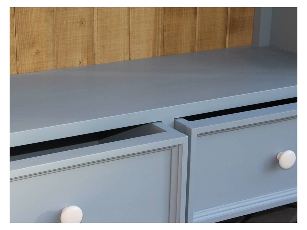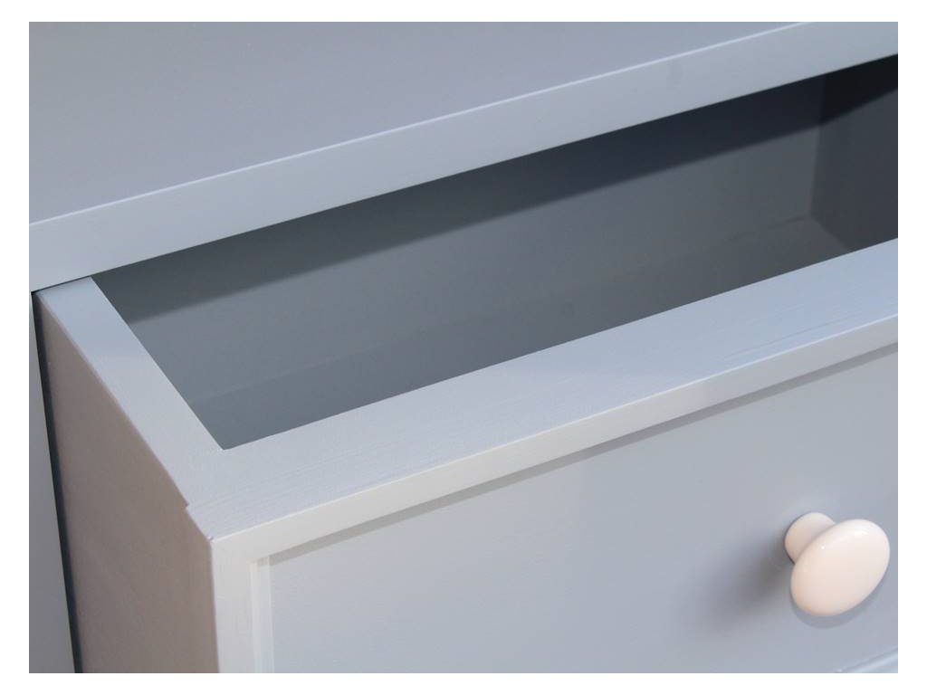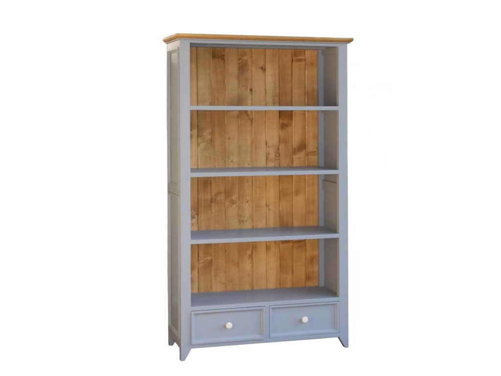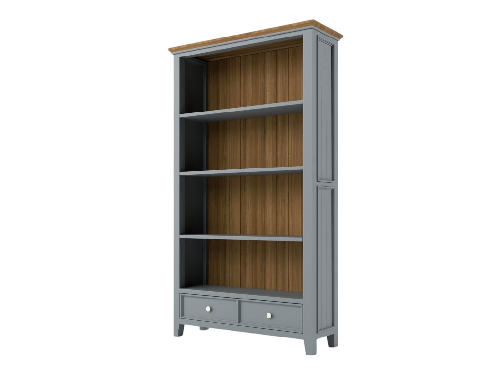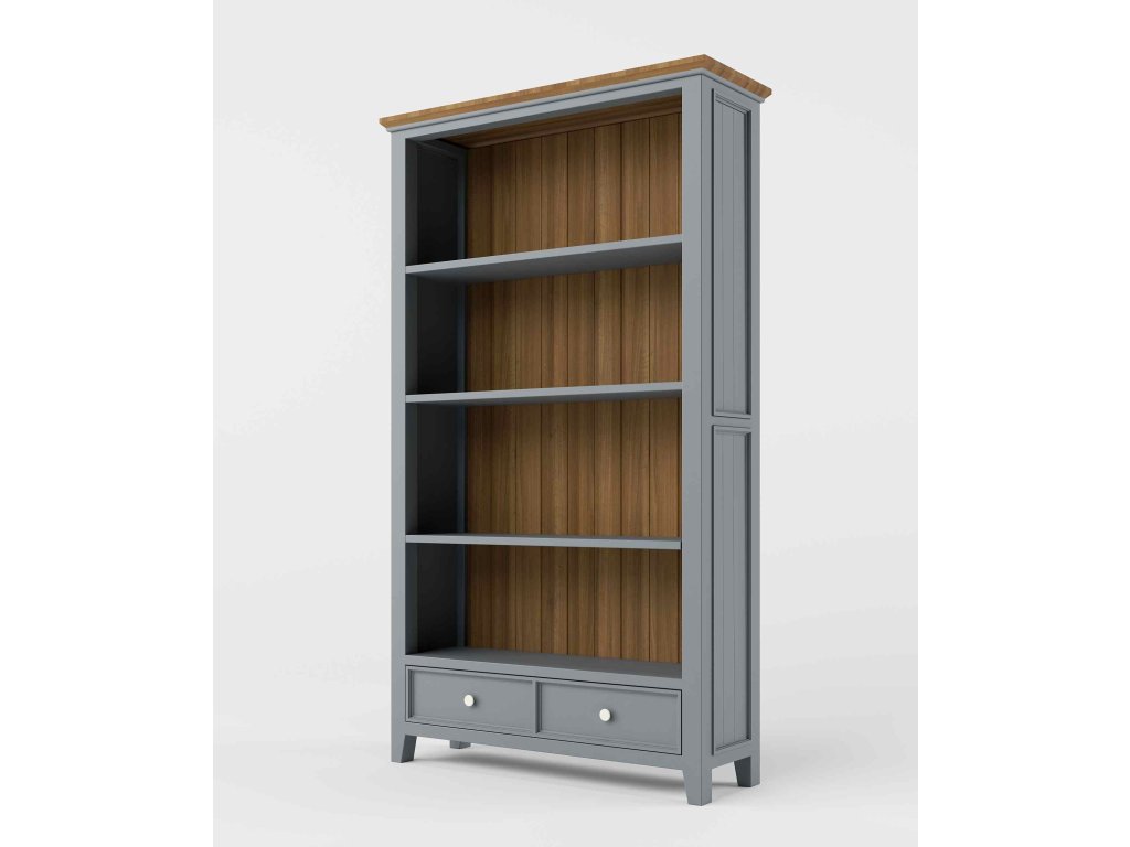 Knižnica PROVENCE z masívneho dreva je kombináciou bukového a dubového dreva. Dubové drevo (vrchná doska) je ošetrené lakom a bukové drevo je ošetrené akrylovou farbou sivomodrej farby. Zásuvky sú bez bežcov. Možno objednať so systémom tichého zatvárania (pre zásuvky).