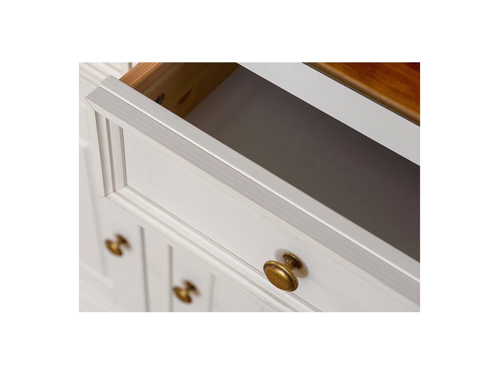 Rustikálna komoda BELLUNO Elegante je vyrobená z masívnej fínskej borovice. Teplá biela farba, ktorá pokrýva povrch nábytku, krásne vyplní interiéry v provensálskom štýle, ako aj interiéry v škandinávskom štýle. Fínska borovica vyniká svojou odolnosťou a krásnou štruktúrou dreva, ktorú cítiť pri každom dotyku.
