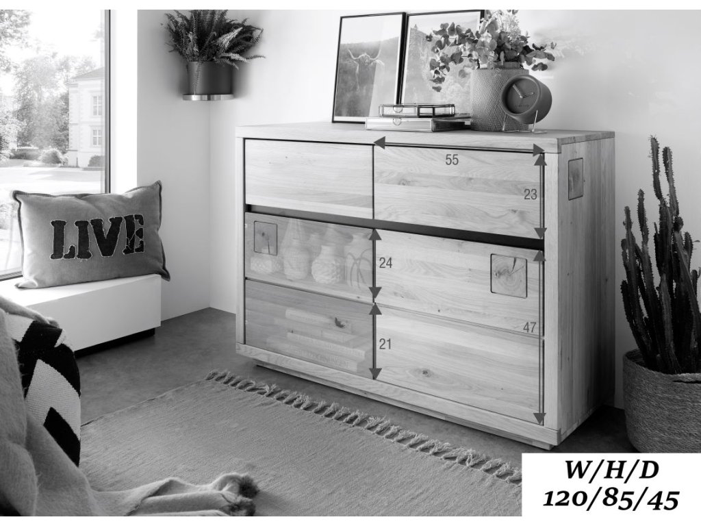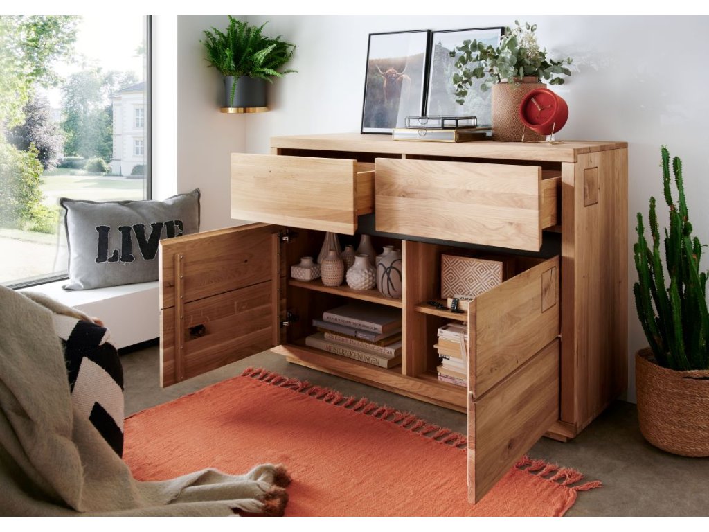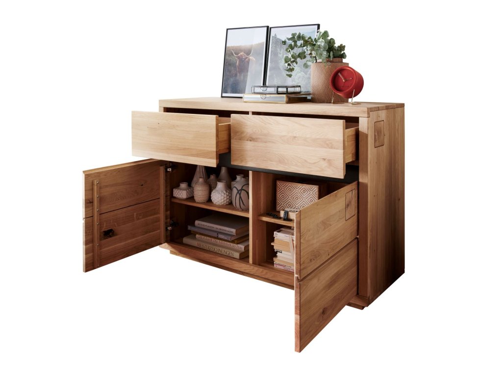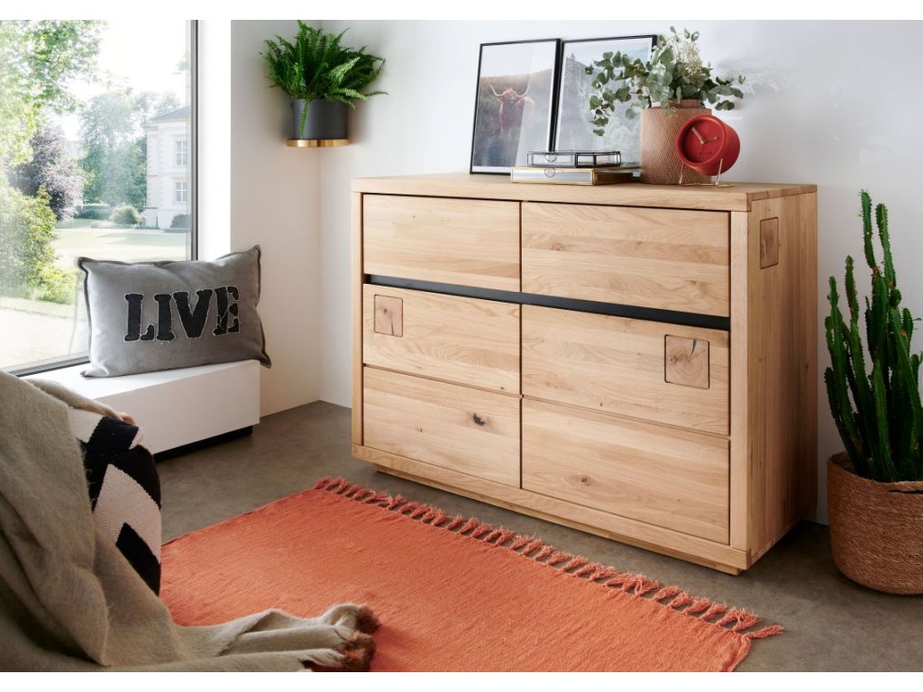 Prezentovaná komoda je zaujímavá aj svojimi detailmi. Dve praktické horné zásuvky sú od spodného úložného priestoru oddelené lištou z čierno lakovaného dubového dreva, ktorá krásne kontrastuje s teplým masívnym drevom a vytvára príjemný estetický efekt. Dvierka komody zdobia dva štvorcové výrezy z dubových trámov, ktoré dodávajú nábytku charakter.