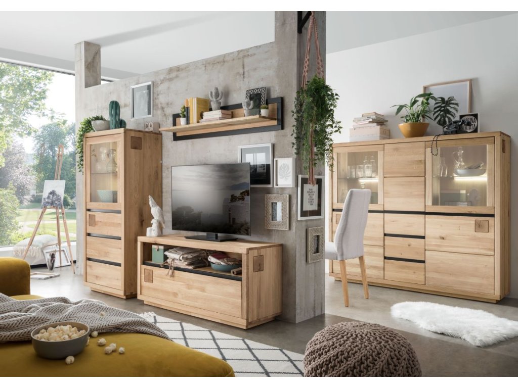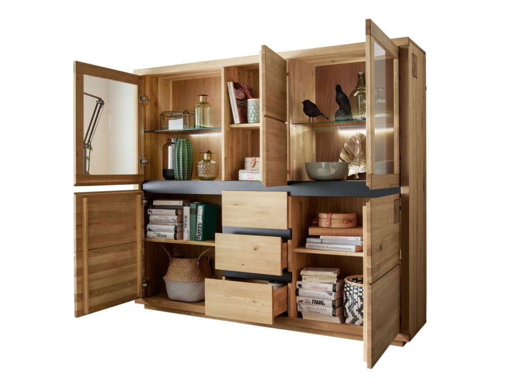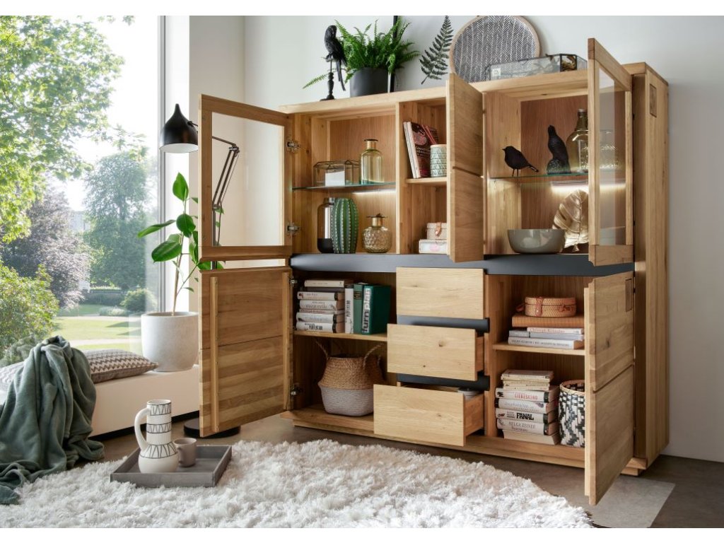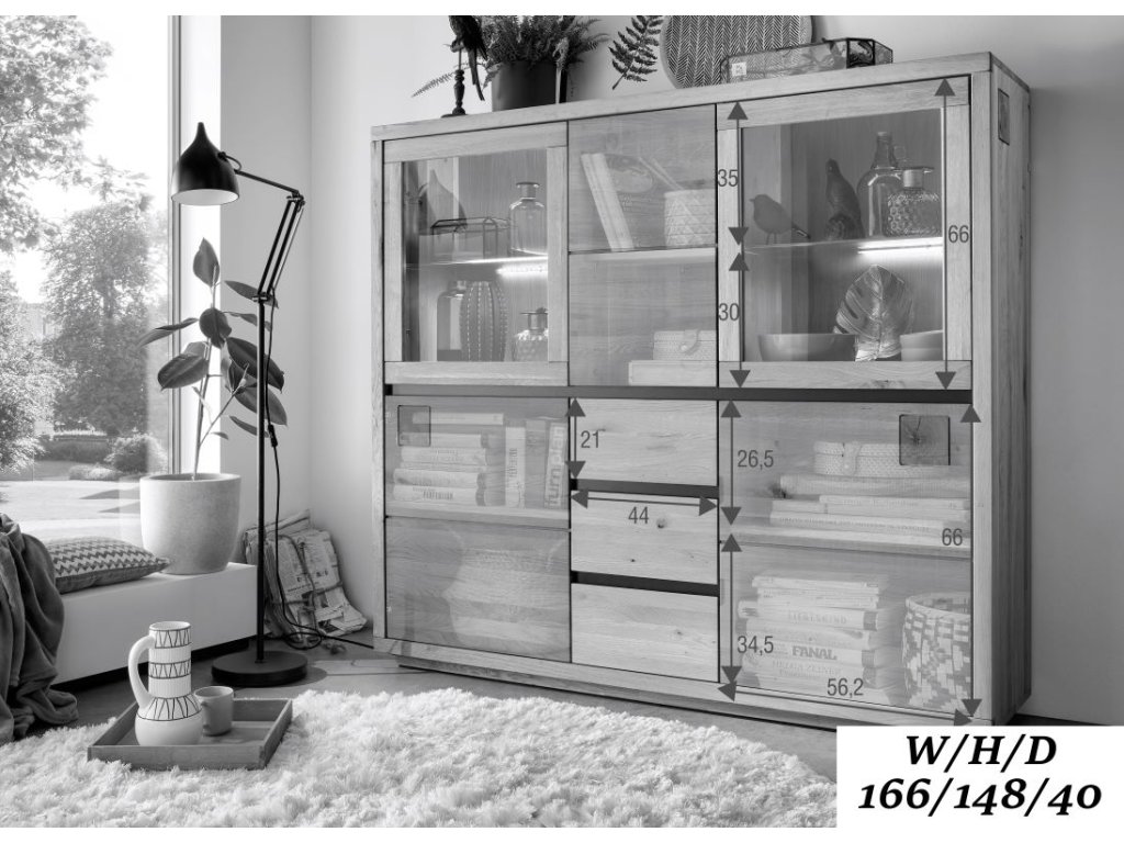 Komoda IV REGATA spája krásu s praktickosťou. Dizajn komody obsahuje dve sklenené priehradky, ktoré sú vhodné na vystavenie kníh, dekoratívnych misiek alebo suvenírov z ciest. Medzi sklenenými priestormi, ako aj pod nimi, sa nachádzajú uzavreté skrinky s policami, ktoré sú ideálne na uschovanie prikrývok, fotoalbumov alebo krabíc so šitím a sezónnymi dekoráciami. Tri praktické zásuvky poskytujú ideálne miesto na odkladanie menších predmetov. Zaujímavý je aj estetický dizajn modelu. Horná časť komody je od spodnej časti oddelená čiernou dubovou lištou, ktorá krásne kontrastuje s teplou dubovou farbou a vytvára príjemný estetický efekt. Rovnaká lišta sa nachádza aj medzi jednotlivými zásuvkami. Tyč však neslúži len ako dizajnový prvok, ale má aj funkčný charakter, pretože uľahčuje otváranie komody. Komoda je napokon zdobená štvorcovými výrezmi z dubových trámov, ktoré osviežujú dizajn nábytku a dodávajú mu šarm.