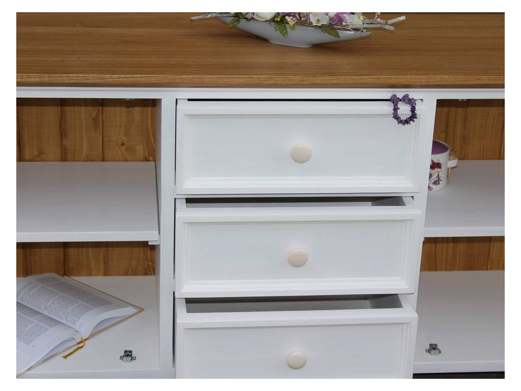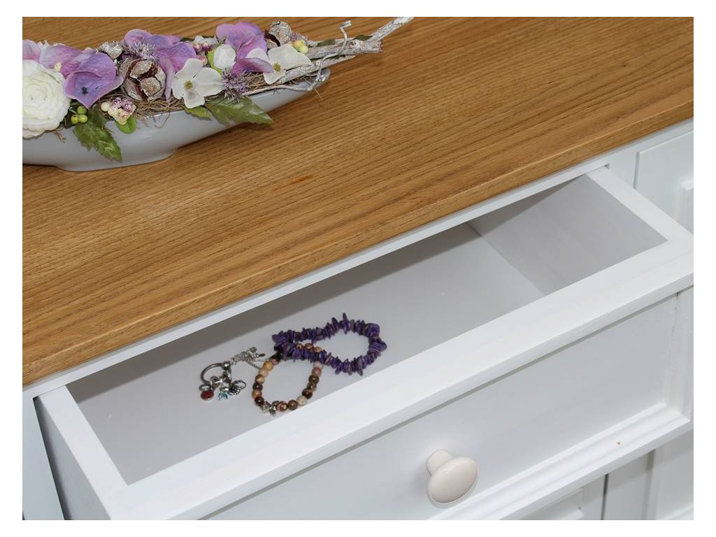 Masívna komoda PROVENCE je kombináciou bukového a dubového dreva. Dubové drevo (vrchná časť) je ošetrené lakom a bukové drevo je ošetrené akrylovou farbou bielej farby. Zásuvky sú bez posunu. Možno objednať so systémom tichého zatvárania (pre zásuvky).