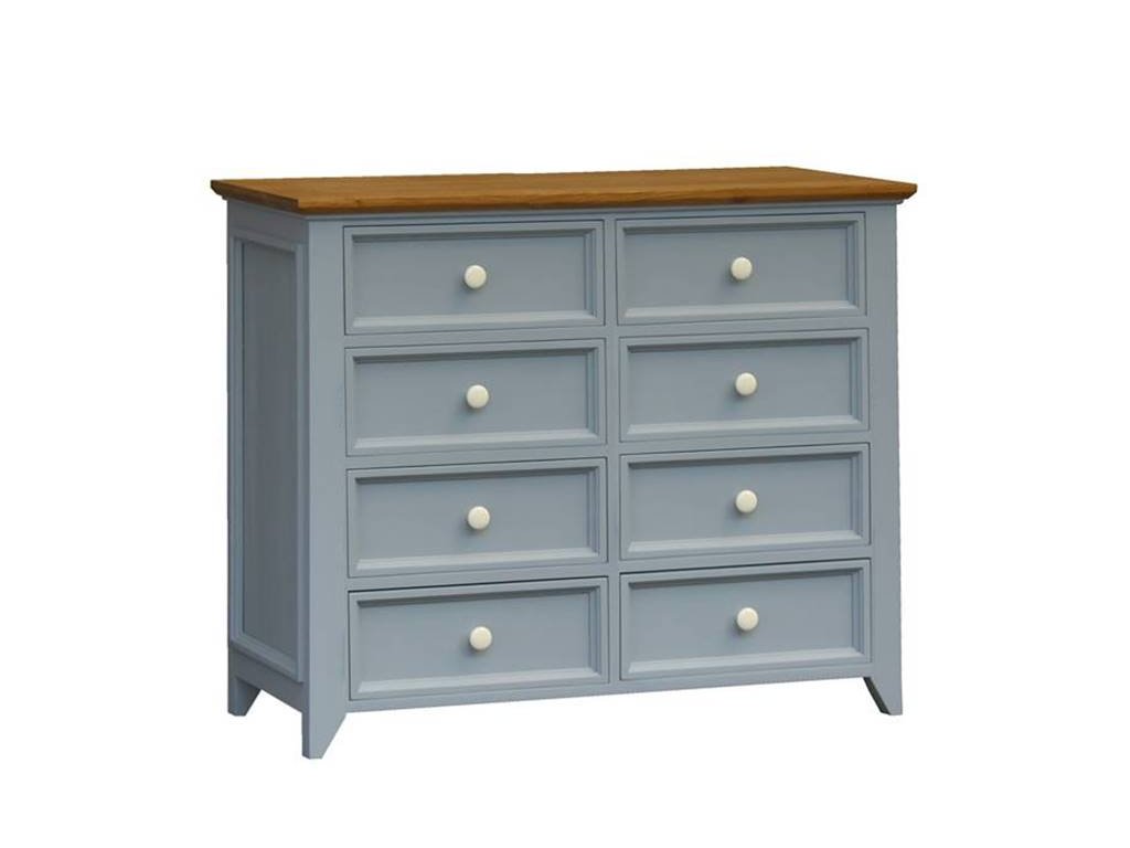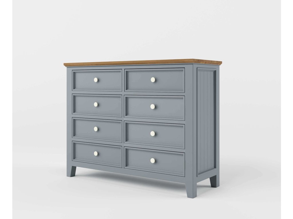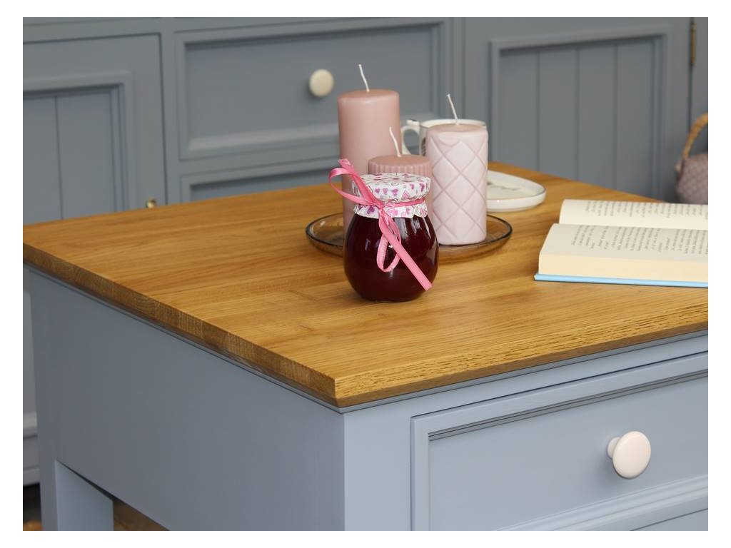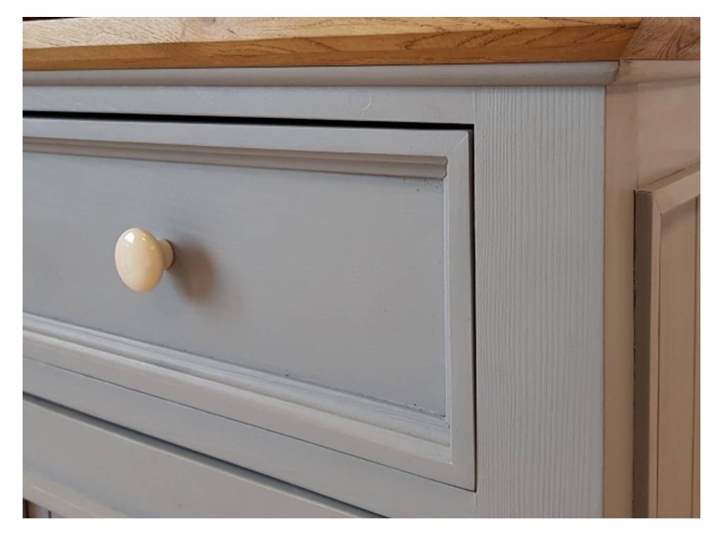 Komoda PROVENCE z masívneho dreva je kombináciou bukového a dubového dreva. Dubové drevo (vrchná časť) je ošetrené lakom a bukové drevo je ošetrené akrylovou farbou v bielej alebo sivomodrej farbe. Zásuvky sú bez posunu. Možno objednať so systémom tichého zatvárania (pre zásuvky) - cena na vyžiadanie.