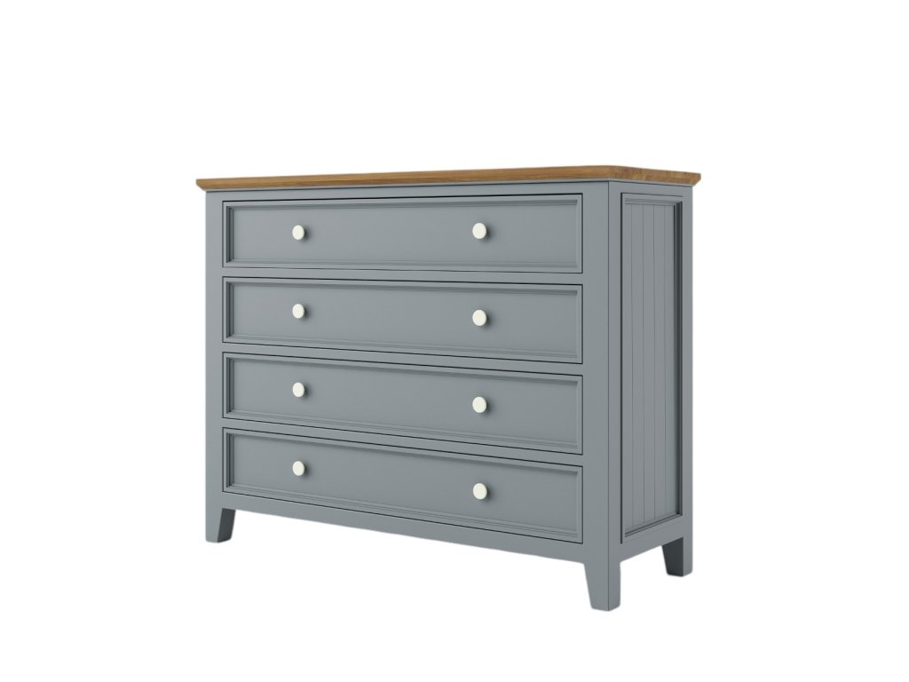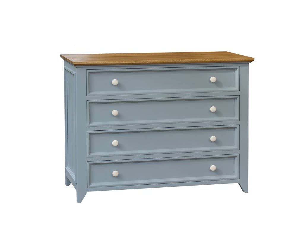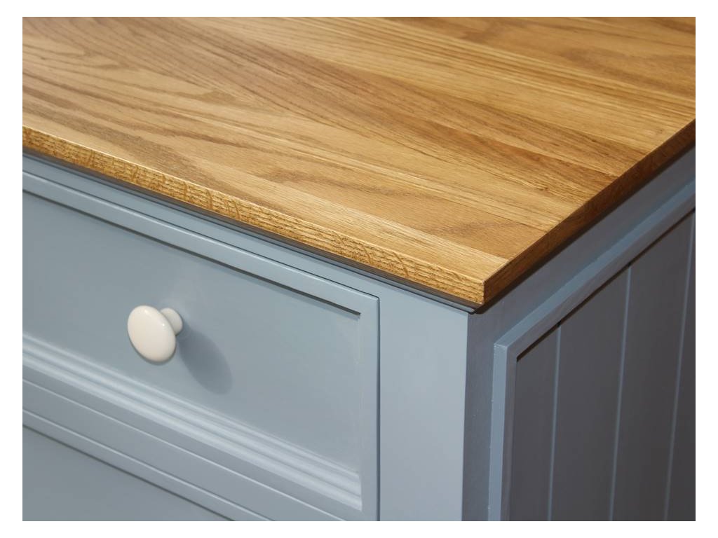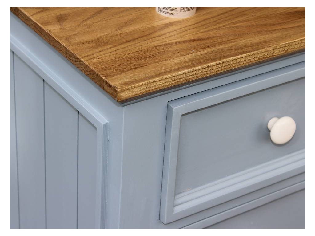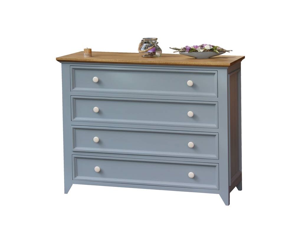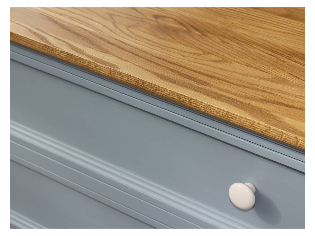 Komoda PROVENCE z masívneho dreva je kombináciou bukového a dubového dreva. Dubové drevo (vrchná doska) je ošetrené lakom a bukové drevo je ošetrené akrylovou farbou sivomodrej farby. Zásuvky sú bez posunu. Možno objednať so systémom tichého zatvárania (pre zásuvky) - cena na vyžiadanie.