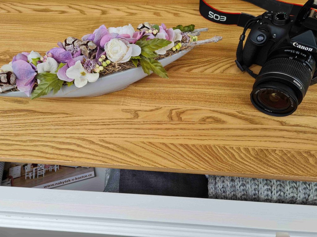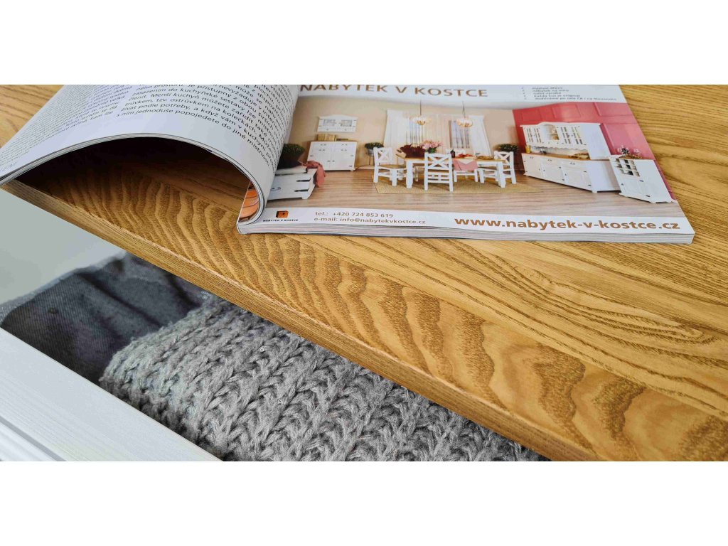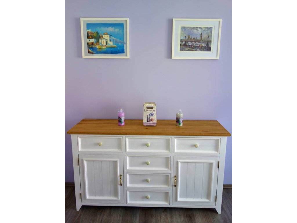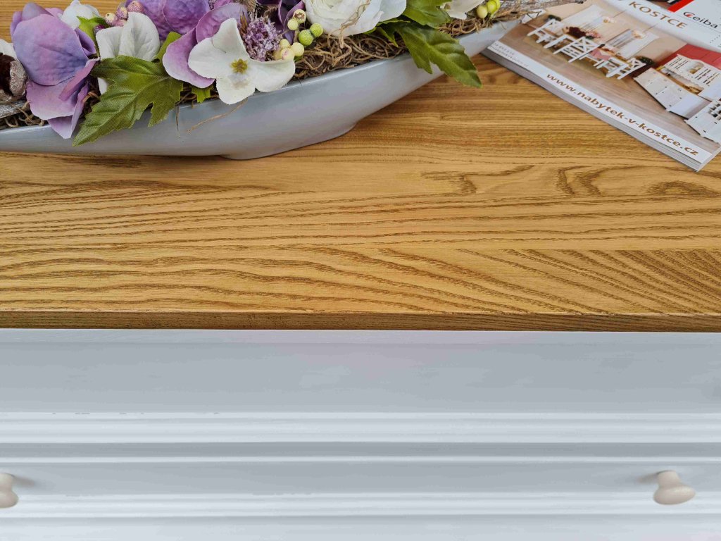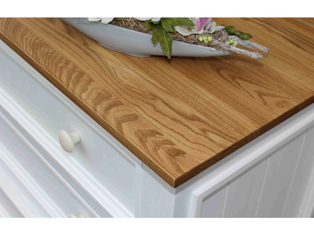 Komoda PROVENCE z masívneho dreva je kombináciou bukového a dubového dreva. Dubové drevo (vrchná časť) je ošetrené lakom a bukové drevo je ošetrené akrylovou farbou bielej farby. Zásuvky sú bez posunu.