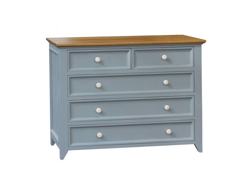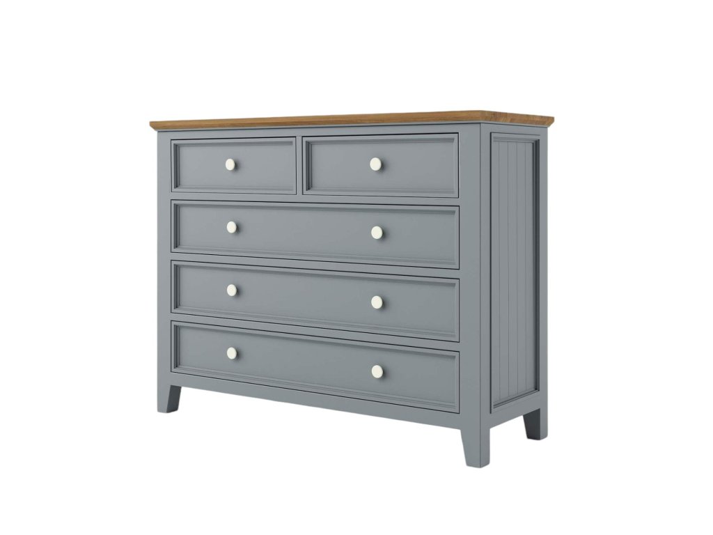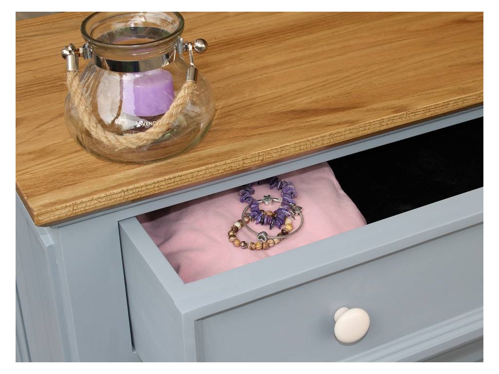 Komoda PROVENCE z masívneho dreva je kombináciou bukového a dubového dreva. Dubové drevo (vrchná doska) je ošetrené lakom a bukové drevo je ošetrené akrylovou farbou sivomodrej farby. Zásuvky sú bez posunu. Možno objednať so systémom tichého zatvárania (pre zásuvky) - cena na vyžiadanie.