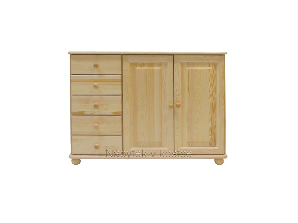 Komoda z masívneho dreva Šumava 38 je úložná komoda s piatimi zásuvkami s kovovými bežcami na ľahké vysúvanie a priestrannými skrinkami. Dvierka tejto skrinky sú zdobené frézovaním, ktoré dodáva celej komode jedinečný a elegantný vzhľad. Komoda je vyrobená z masívneho borovicového dreva a je lakovaná bezfarebným lakom, ktorý zabraňuje prípadnému poškriabaniu a pomáha zachovať trvalú krásu prírodného vzhľadu. Zadná strana je vyrobená zo sololitu, čo je drevovláknitá doska. Komoda stabilne stojí na okrúhlych drevených nohách. Celkový vzhľad komody dotvárajú okrúhle úchyty na zásuvkách a skrinke. Táto priestranná komoda je vhodná na uloženie oblečenia, detských hračiek alebo čohokoľvek iného v domácnosti. Všetky materiály použité v komode spĺňajú prísne európske kritériá zdravotnej a environmentálnej bezpečnosti.