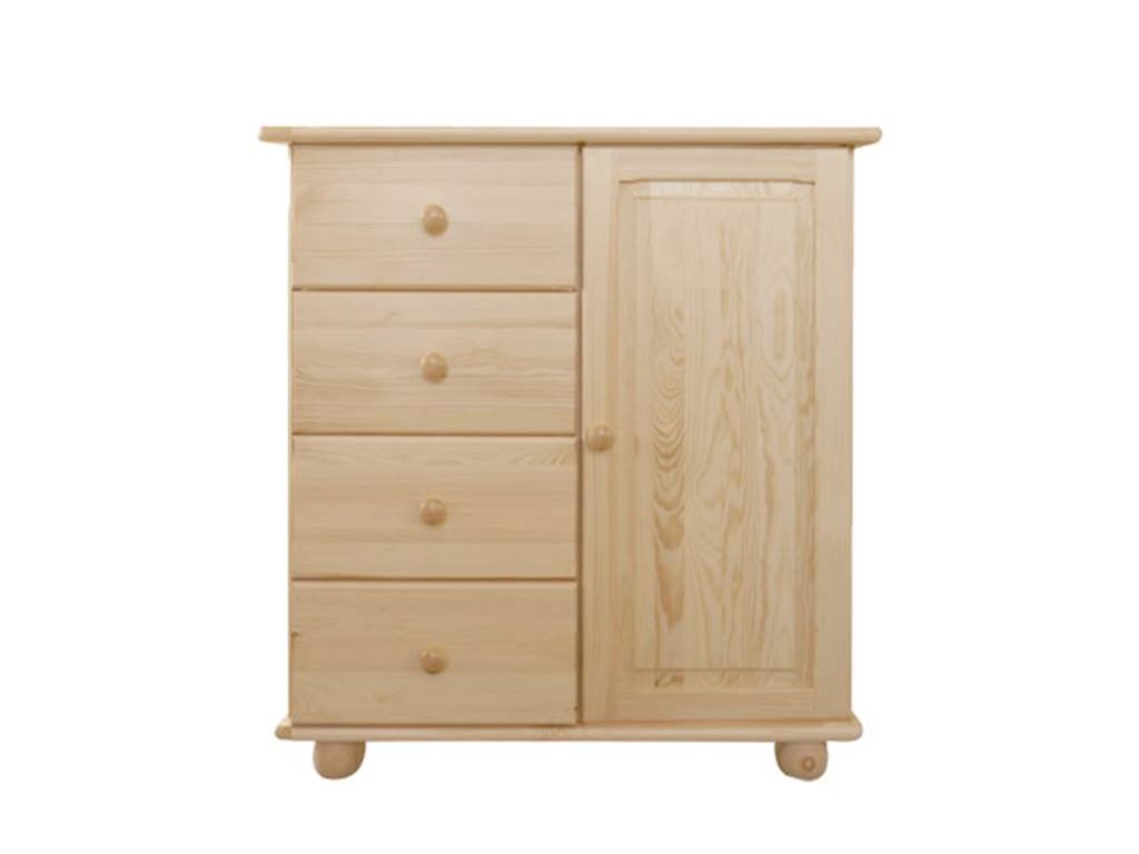 Komoda z masívneho dreva Šumava 47 je praktická komoda s piatimi zásuvkami a skrinkou na všestranné použitie. Komoda je vyrobená z kvalitného masívneho borovicového dreva s jemným frézovaním na dvierkach. Komoda má päť zásuviek s kovovými bežcami, ktoré zabezpečujú pohodlné vysúvanie. Čelá zásuviek, ako aj dvierka skriniek sú vybavené okrúhlymi drevenými úchytkami. Zadná strana je vyrobená zo sololitu, čo je drevovláknitá doska. Stabilitu komody zabezpečujú štyri okrúhle drevené nohy. Komoda je lakovaná bezfarebným lakom, ktorý pomáha predchádzať prípadným škrabancom a zároveň pomáha zachovať trvalú krásu prírodného vzhľadu. Všetky materiály použité v komode spĺňajú prísne európske kritériá zdravotnej a environmentálnej bezpečnosti.