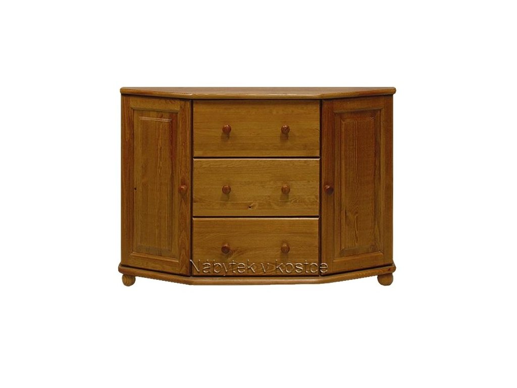 Komoda z masívu 52 je elegantná a účelná komoda v tmavom vyhotovení z borovicového dreva, ktorá prevonia celý interiér vášho domova. Vyniká tým, že jeho predná časť akoby vychádzala do priestoru. Má úložný priestor v podobe dvoch skriniek s ozdobným frézovaním a štyroch zásuviek uprostred s kvalitnými kovovými bežcami. Celkový dojem komody vytvárajú okrúhle úchyty na zásuvkách a skriniach, ktoré majú rovnaký tvar ako masívne nohy tejto komody. Komoda je lakovaná ekologickým bezfarebným lakom, ktorý ju chráni pred mechanickým poškodením, uľahčuje údržbu a pomáha komode dlhodobo si zachovať aktuálny vzhľad.