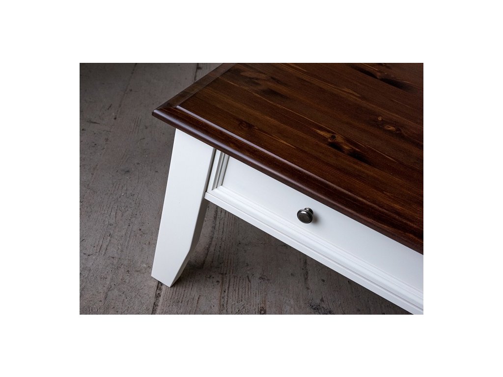 Rustikálny konferenčný stolík BELLUNO Elegante je vyrobený z masívnej fínskej borovice. Teplá biela farba, ktorá pokrýva povrch nábytku, krásne vyplní interiéry v provensálskom štýle, ako aj interiéry v škandinávskom štýle. Fínska borovica vyniká svojou odolnosťou a krásnou štruktúrou dreva, ktorú cítiť pri každom dotyku.
