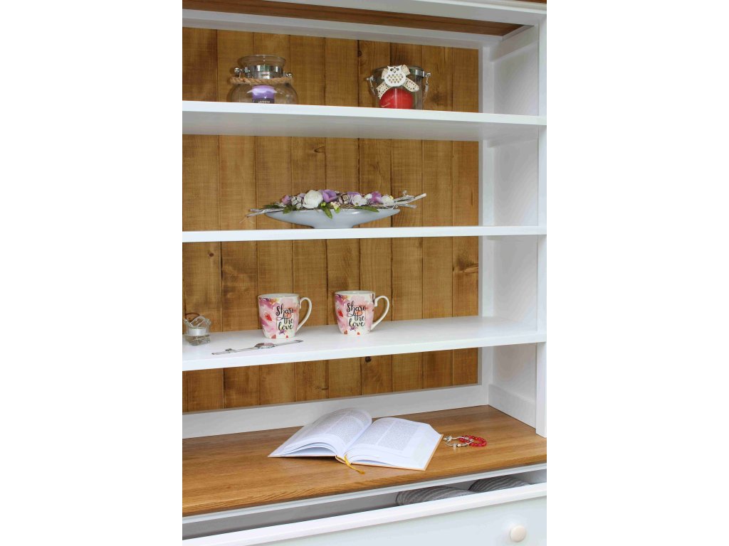 Kredenc z masivu PROVENCE je spojením bukového a dubového dřeva. Dubové dřevo (horní deska) je ošetřeno lakem a bukové dřevo je ošetřeno akrylovou barvou v bílé barvě. Šuplík je bez pojezdů. Možnost objednání se systémem tichého dovírání (u šuplíků).