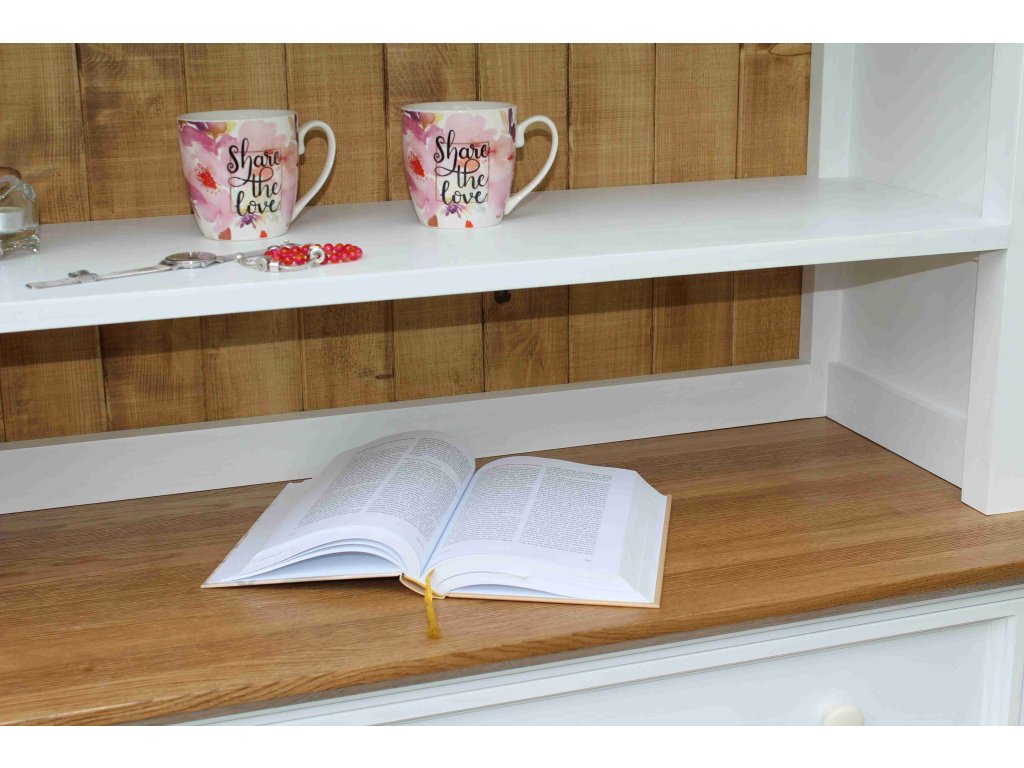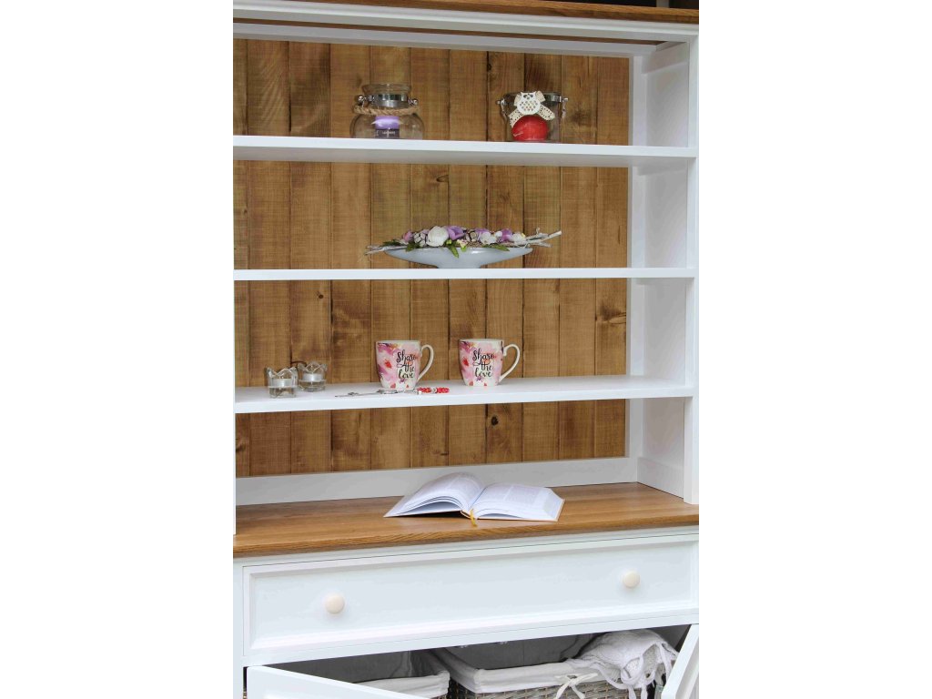 Kredenc z masivu PROVENCE je spojením bukového a dubového dřeva. Dubové dřevo (horní deska) je ošetřeno lakem a bukové dřevo je ošetřeno akrylovou barvou v bílé barvě. Šuplík jsou bez pojezdů. Možnost objednání se systémem tichého dovírání (u šuplíků).