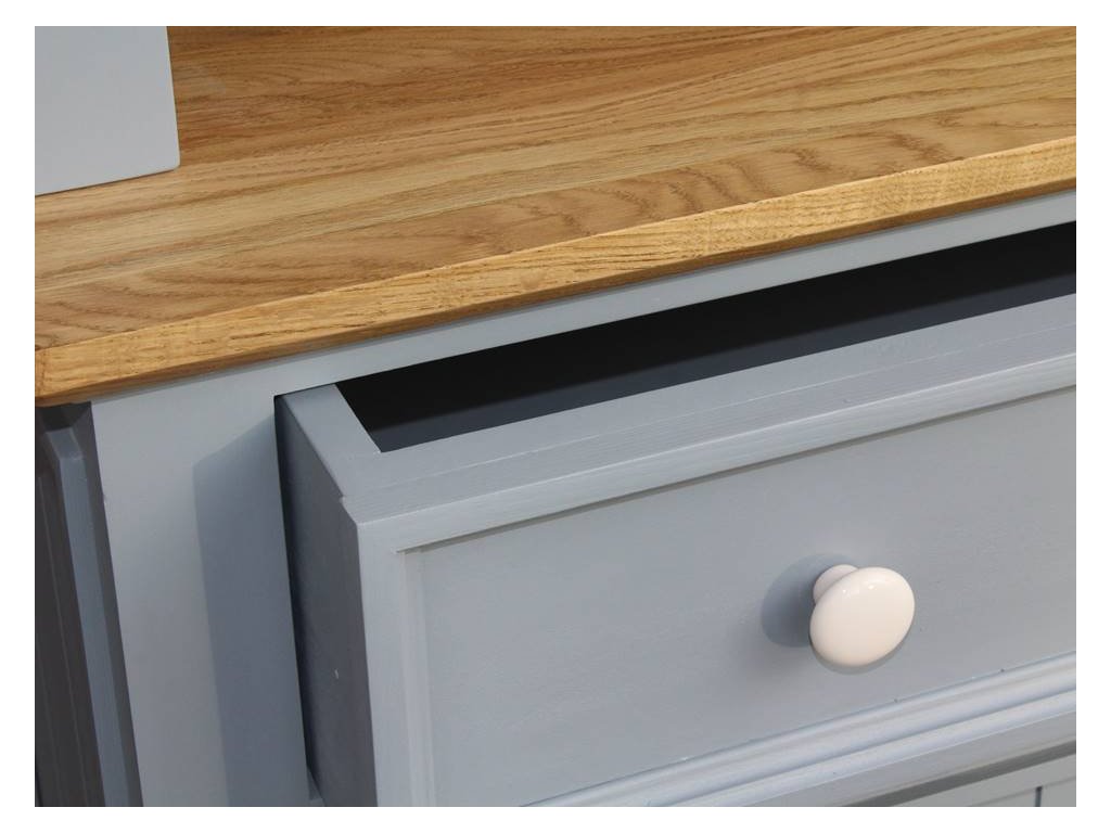 Kredenc z masivu PROVENCE je spojením bukového a dubového dřeva. Dubové dřevo (horní deska) je ošetřeno lakem a bukové dřevo je ošetřeno akrylovou barvou v šedomodré barvě. Šuplík je bez pojezdu. Možnost objednání se systémem tichého dovírání (u šuplíků).