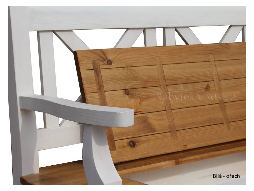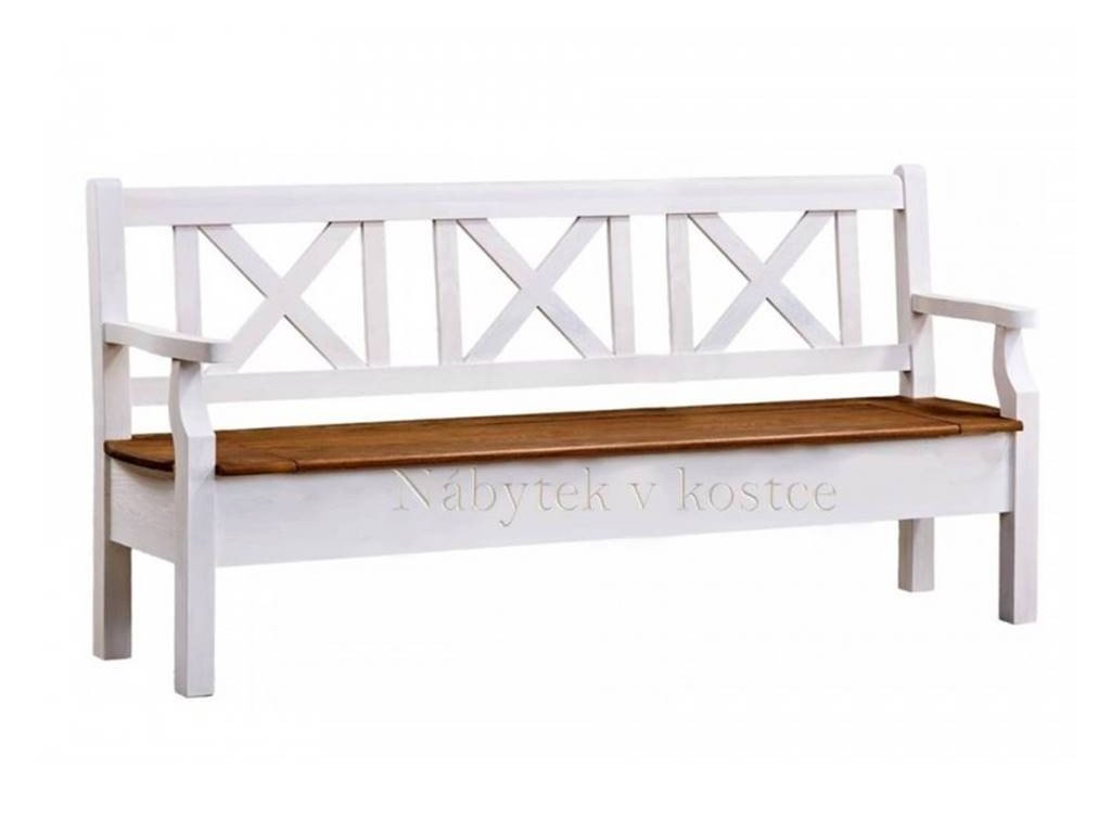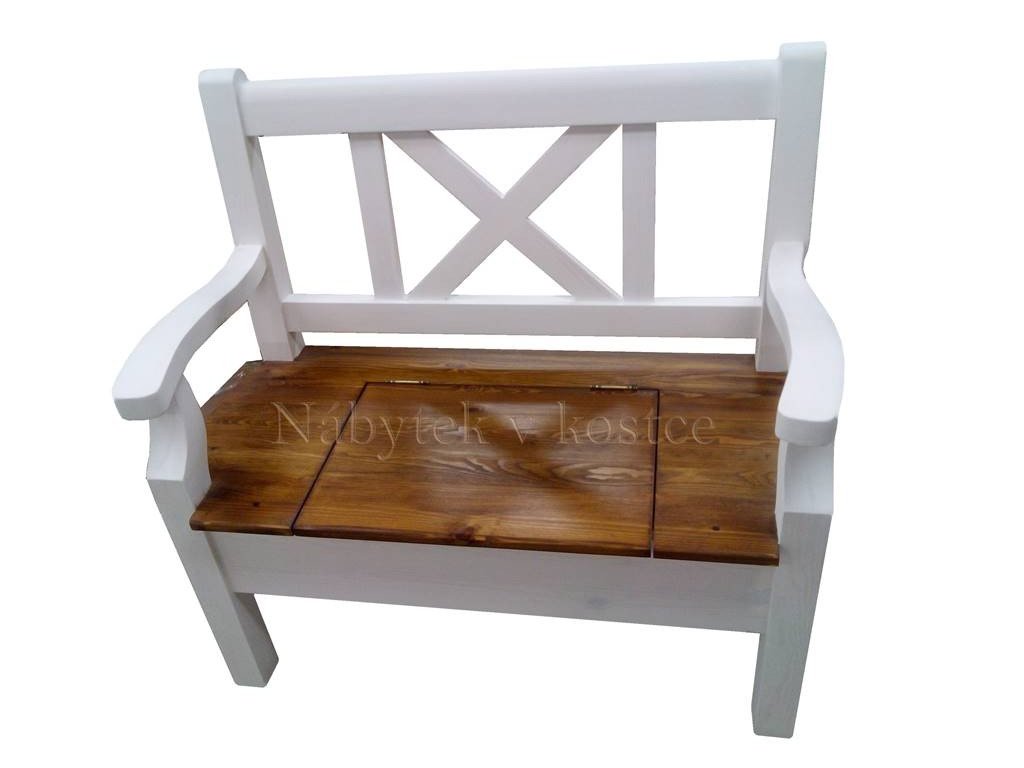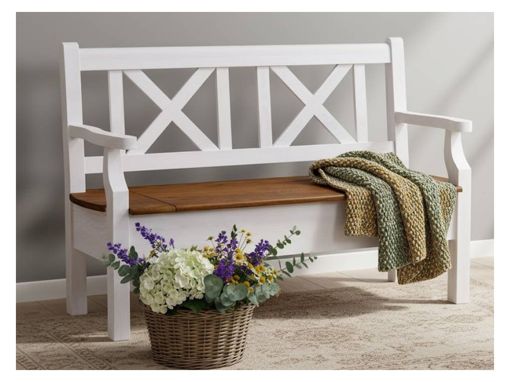 Rustikálna lavica SWEET HOME s úložným priestorom je vyrobený z masívneho borovicového dreva a je ošetrený bielou vodou riediteľnou farbou. Vrchnú dosku možno ošetriť voskom alebo lakom.