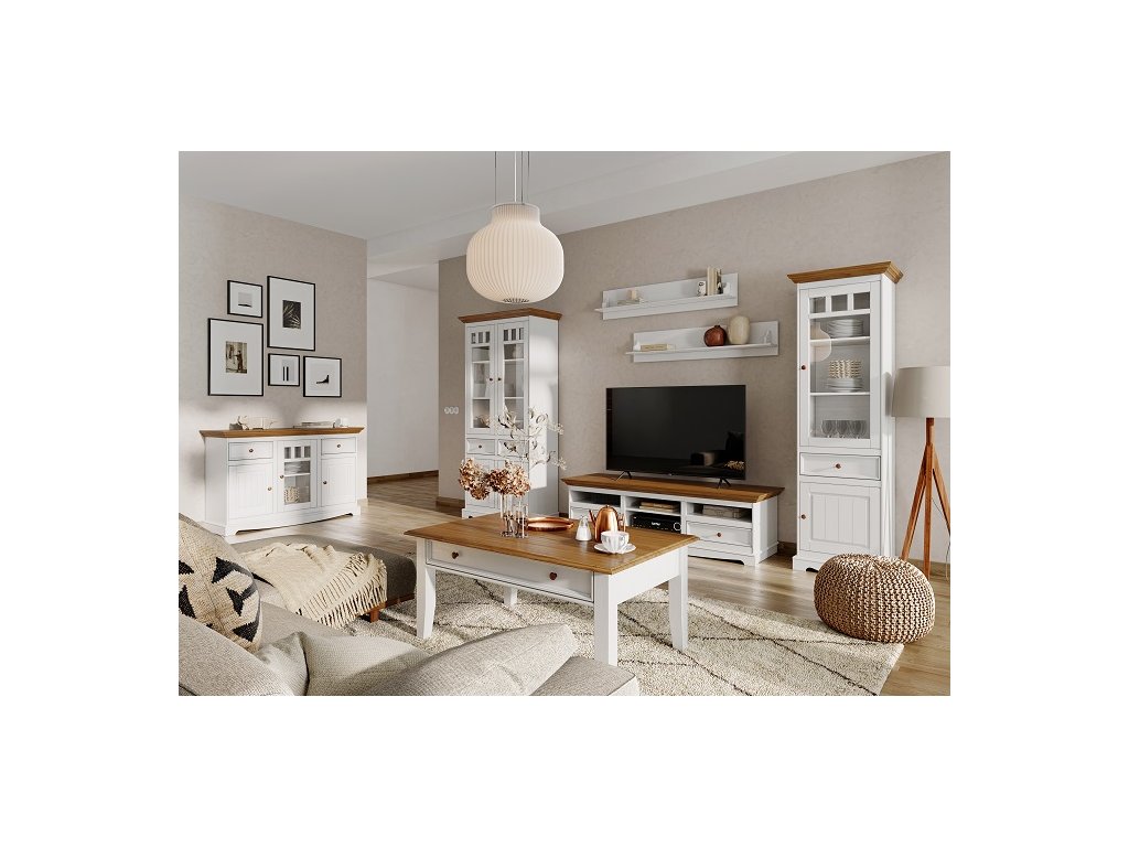 Rustikálny konferenčný stolík BELLUNO Elegante je vyrobený z masívnej fínskej borovice. Teplá biela farba, ktorá pokrýva povrch nábytku, krásne vyplní interiéry v provensálskom štýle, ako aj interiéry v škandinávskom štýle. Fínska borovica vyniká svojou odolnosťou a krásnou štruktúrou dreva, ktorú cítiť pri každom dotyku.