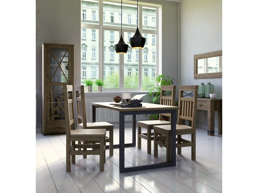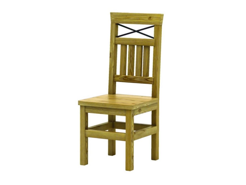 Masivní židle METAL 15 má pevnou a odolnou konstrukci. Židle se skládá ze čtyř okrasných nohou s kováním. Sedák je umístěn ve výšce 45 cm. Opěradlo má 4 vertikální lamely s kovovým křížem nahoře.