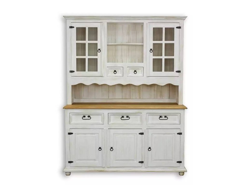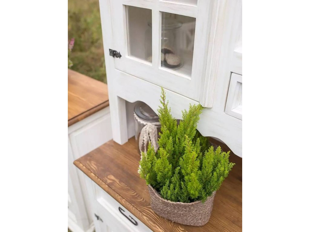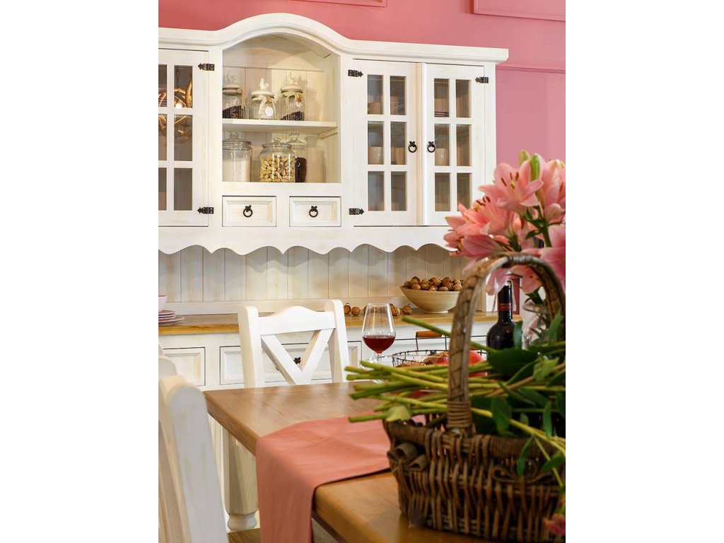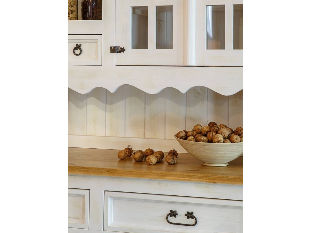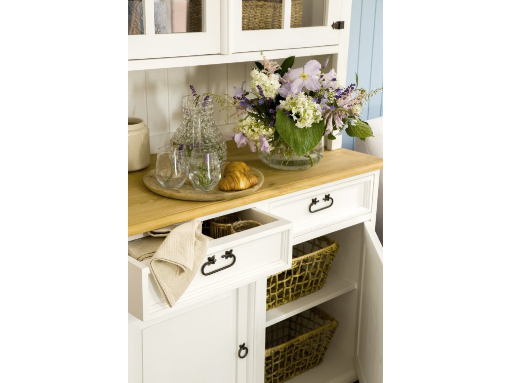 Masívny príborník WHITE HOME Slim sa skladá z dvoch častí. Vľavo hore a vpravo hore sú sklenené dvere, za ktorými sú dve police. Dvere sú oddelené dvoma zásuvkami s policou nad nimi. V spodnej časti sa nachádzajú tri drevené zásuvky a skrinky, v ktorých je jedna polica. Kredenc stojí na okrúhlych nohách.