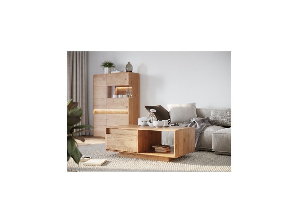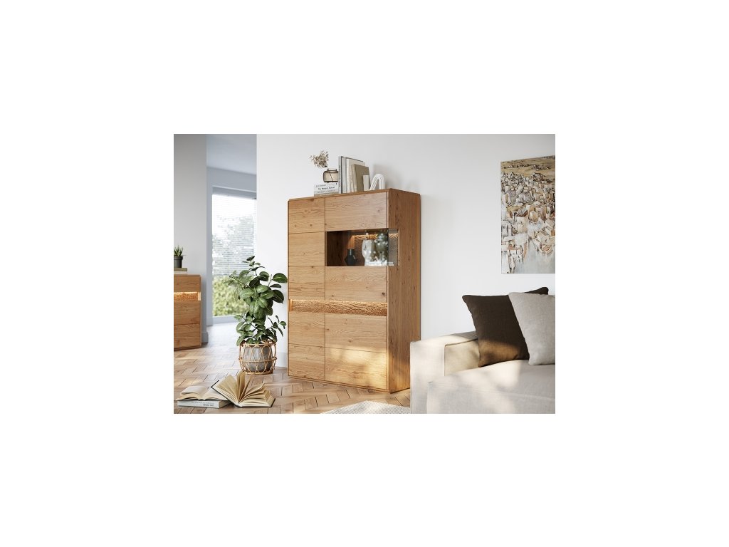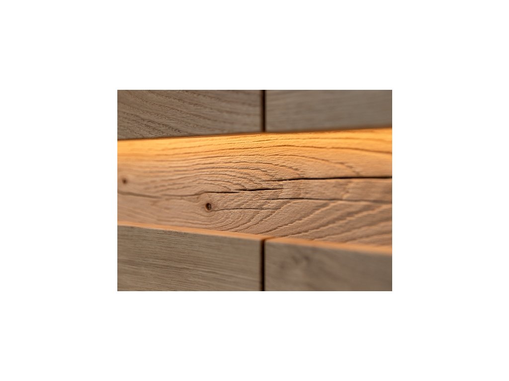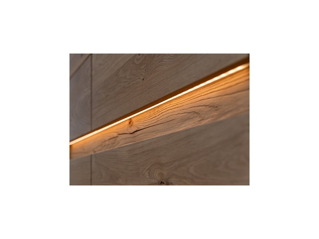 Nízka dubová vitrína 2D DIVISIONE je vyrobená z masívneho olejovaného dubového dreva, ktoré jej dodáva pevnosť, stabilitu, odolnosť a trvácnosť, takže sa z jej krásy budete tešiť mnoho rokov po zakúpení. Praktickosť a štýl sa spájajú s vysokou kvalitou. Príkladom je zapustená lišta z brúseného dubového dreva, ktorá pôsobí nielen ako zaujímavý estetický detail, ale uľahčuje aj otváranie dvierok vitríny. Vašu pozornosť určite upúta sklenená polica, ktorej zadná strana je opäť z brúseného dubového dreva. Tvarovanie a sklenená časť vitríny sú nápadito osvetlené svetlami LED, ktoré v kombinácii so štruktúrou dubových dosiek vytvárajú doslova magické predstavenie.