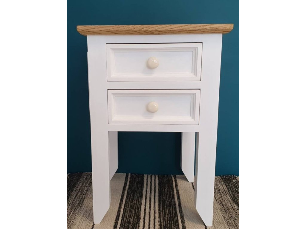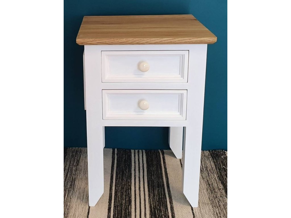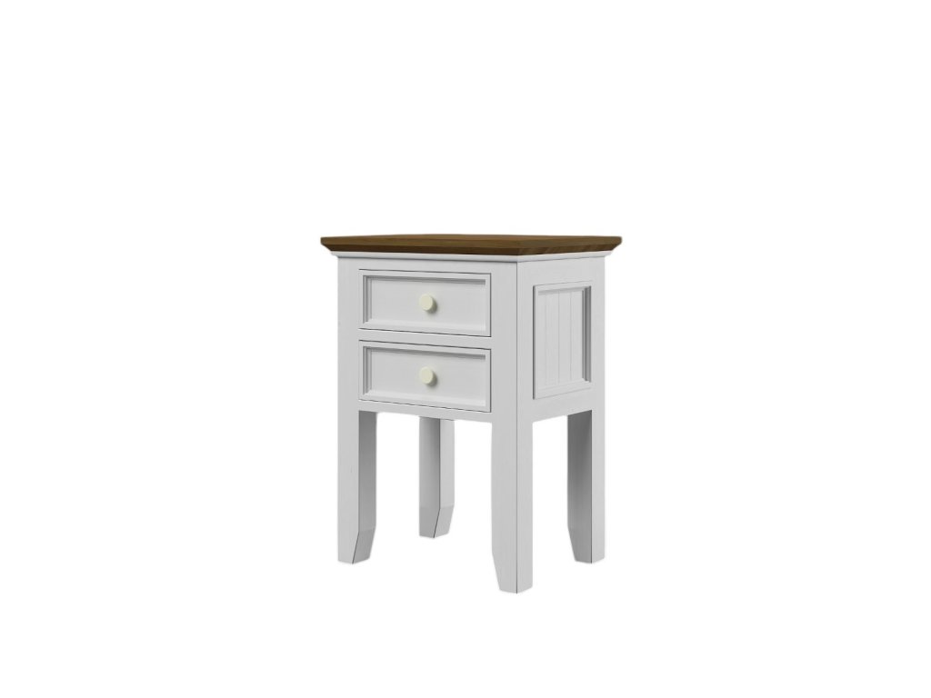 Masívny nočný stolík PROVENCE je kombináciou bukového a dubového dreva. Dubové drevo (vrchná doska) je ošetrené lakom a bukové drevo je ošetrené akrylovou farbou. Zásuvky sú bez posunu. Možno objednať so systémom tichého zatvárania (pre zásuvky) - cena na vyžiadanie.