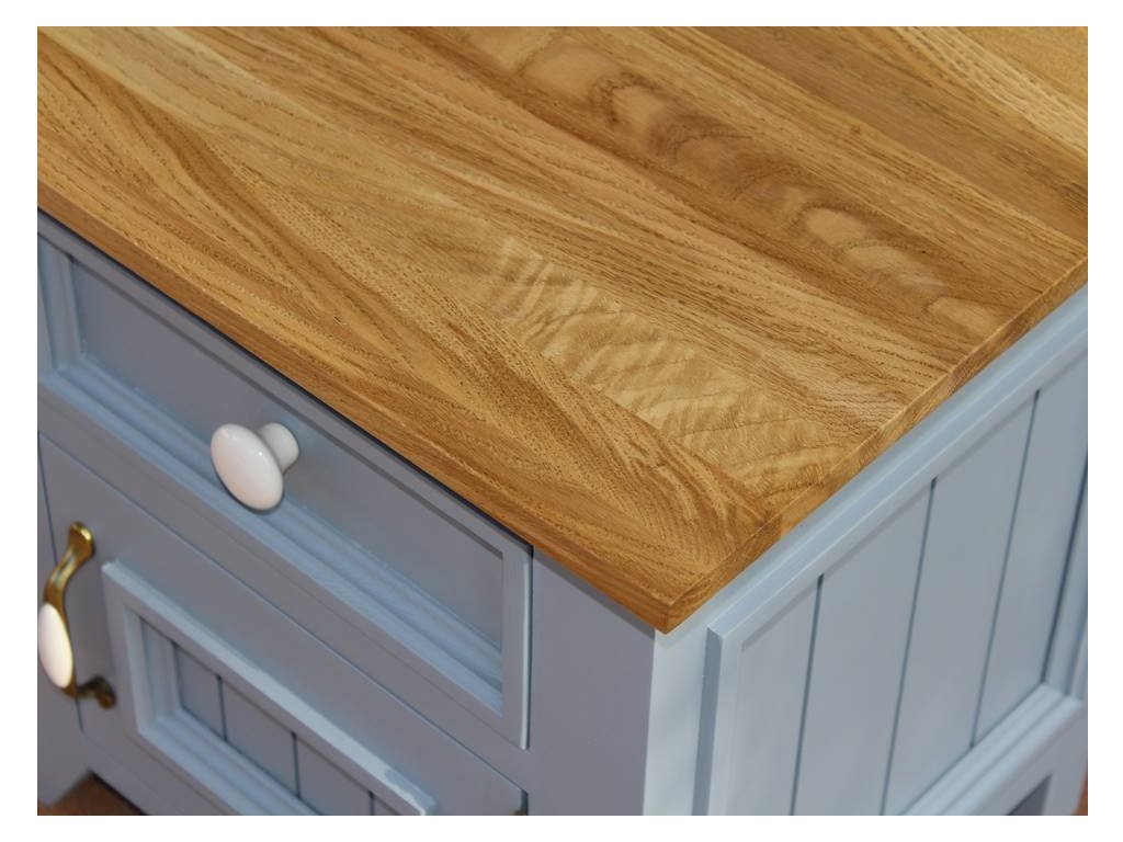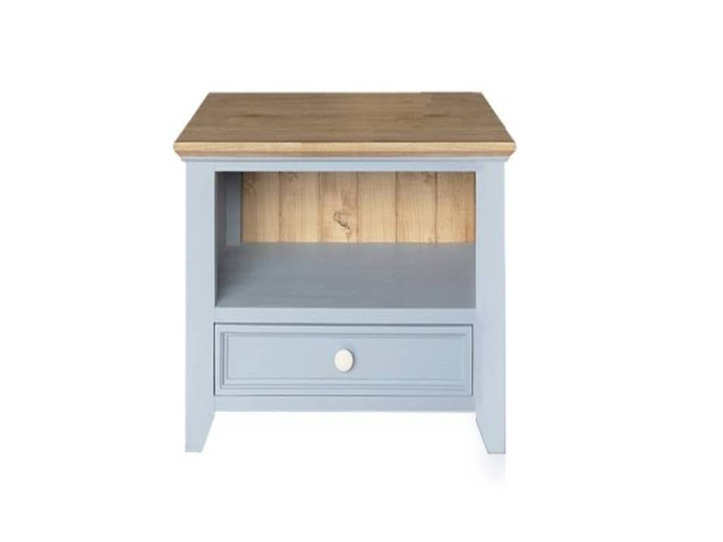 Nočný stolík PROVENCE z masívneho dreva je kombináciou bukového a dubového dreva. Dubové drevo (vrchná doska) je ošetrené lakom a bukové drevo je ošetrené akrylovou farbou sivomodrej farby. Zásuvka je bez pohybu. Možno objednať so systémom tichého zatvárania (pre zásuvky) - cena na vyžiadanie.