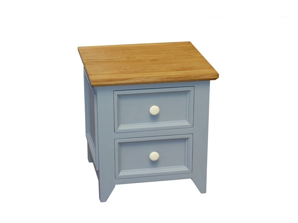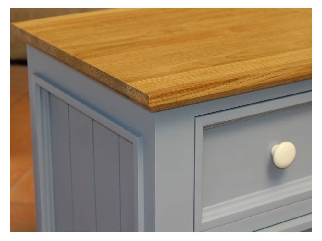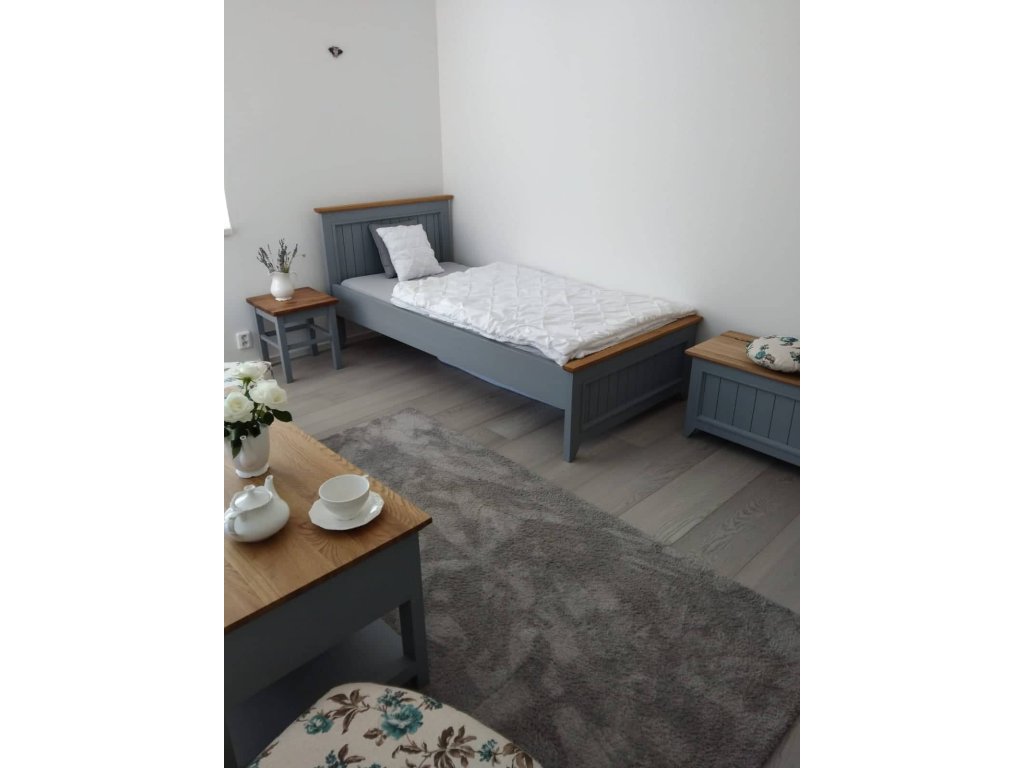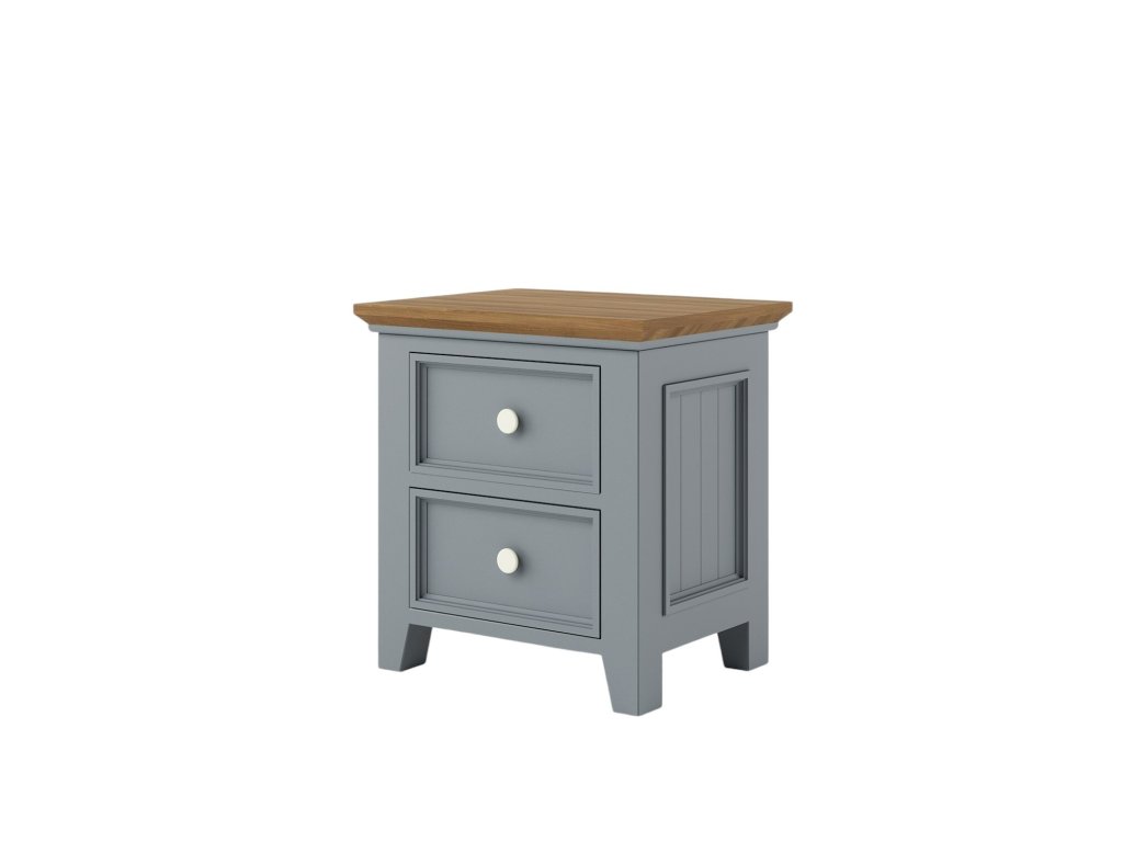 Nočný stolík PROVENCE z masívneho dreva je kombináciou bukového a dubového dreva. Dubové drevo (vrchná doska) je ošetrené lakom a bukové drevo je ošetrené akrylovou farbou sivomodrej farby. Zásuvky sú bez posunu. Možno objednať so systémom tichého zatvárania (pre zásuvky) - cena na vyžiadanie.