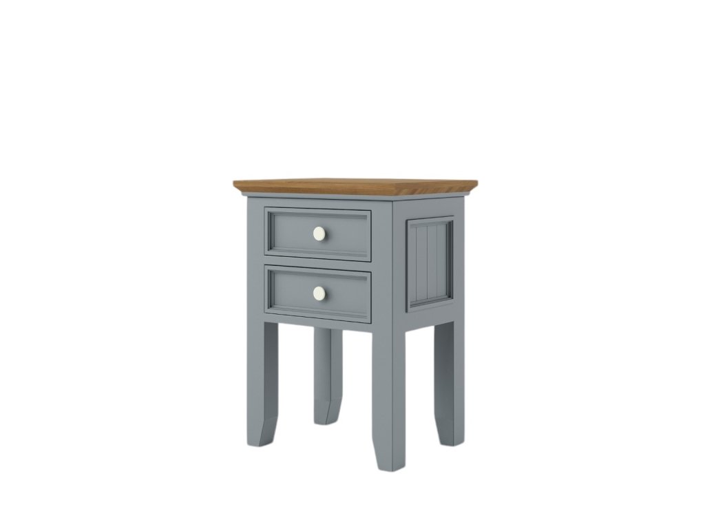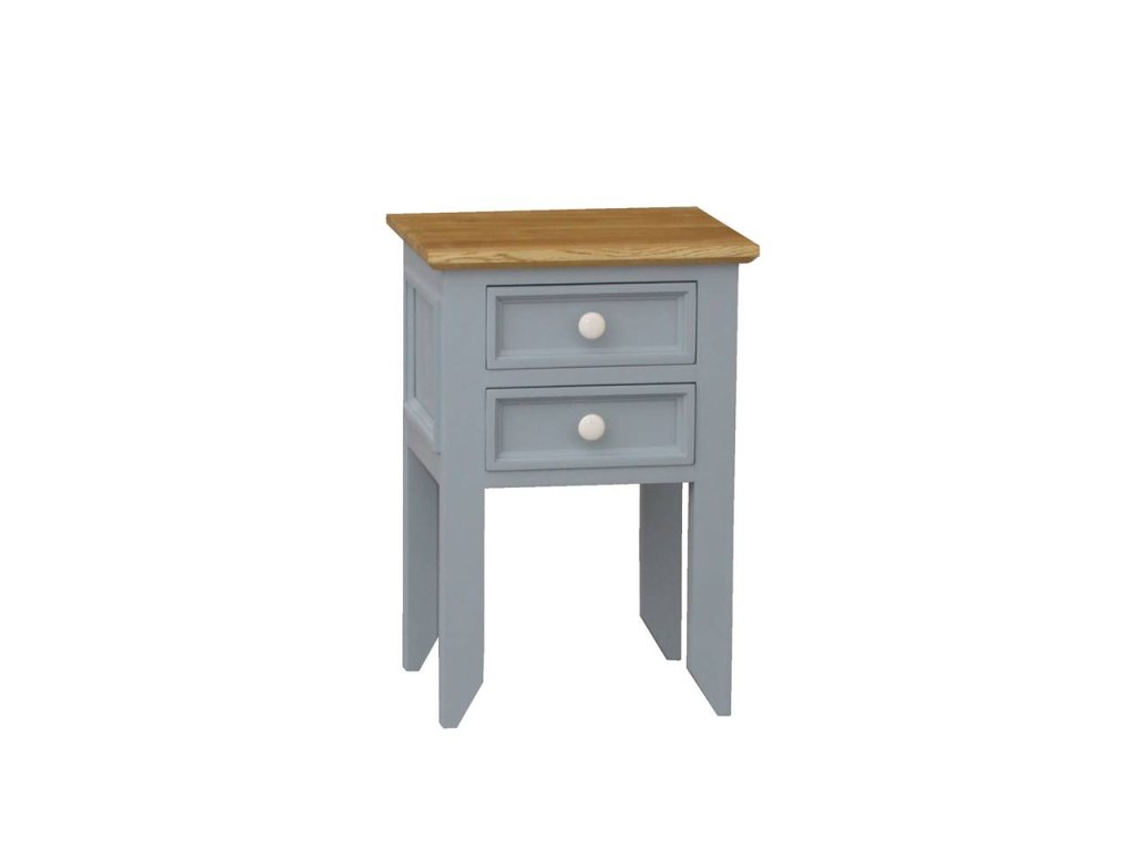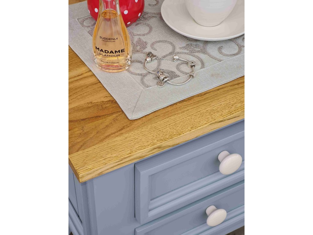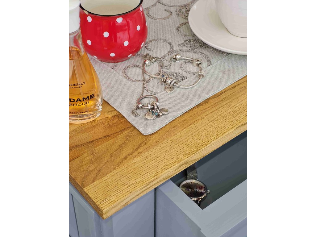 Masívny nočný stolík PROVENCE je kombináciou bukového a dubového dreva. Dubové drevo (vrchná doska) je ošetrené lakom a bukové drevo je ošetrené akrylovou farbou. Zásuvky sú bez posunu. Možno objednať so systémom tichého zatvárania (pre zásuvky).