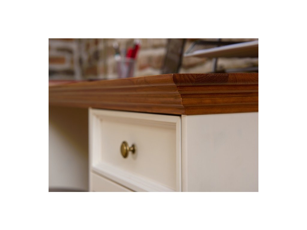 Rustikálny písací stôl BELLUNO Elegante z masívneho dreva je vyrobený z masívnej fínskej borovice. Teplá biela farba, ktorá pokrýva povrch nábytku, krásne vyplní interiéry v provensálskom štýle, ako aj interiéry v škandinávskom štýle. Fínska borovica vyniká svojou odolnosťou a krásnou štruktúrou dreva, ktorú cítiť pri každom dotyku.