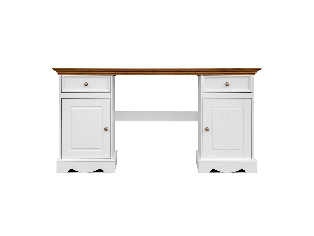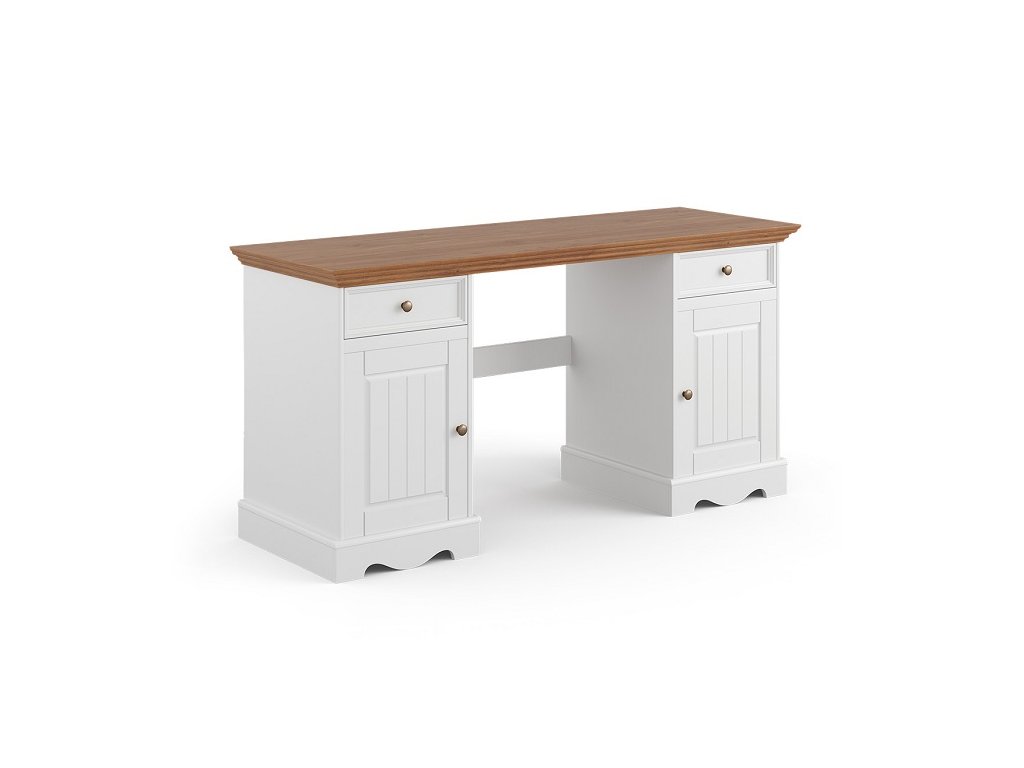 Stôl BELLUNO Elegante z borovicového dreva je vhodnou voľbou pre minimalistov, ktorí majú radi klasický nábytok. Ide o pevný biely stôl s drevenou doskou, ktorý je ideálny na prácu alebo štúdium a hodí sa do každej domácnosti. Vďaka zásuvkám a skrinkám na oboch stranách stola máte pri práci alebo štúdiu dostatok úložného priestoru. Zásuvky sú tiež vybavené systémom tichého zatvárania. Prírodné drevo, z ktorého je stôl vyrobený, dodáva interiéru jedinečnú atmosféru.