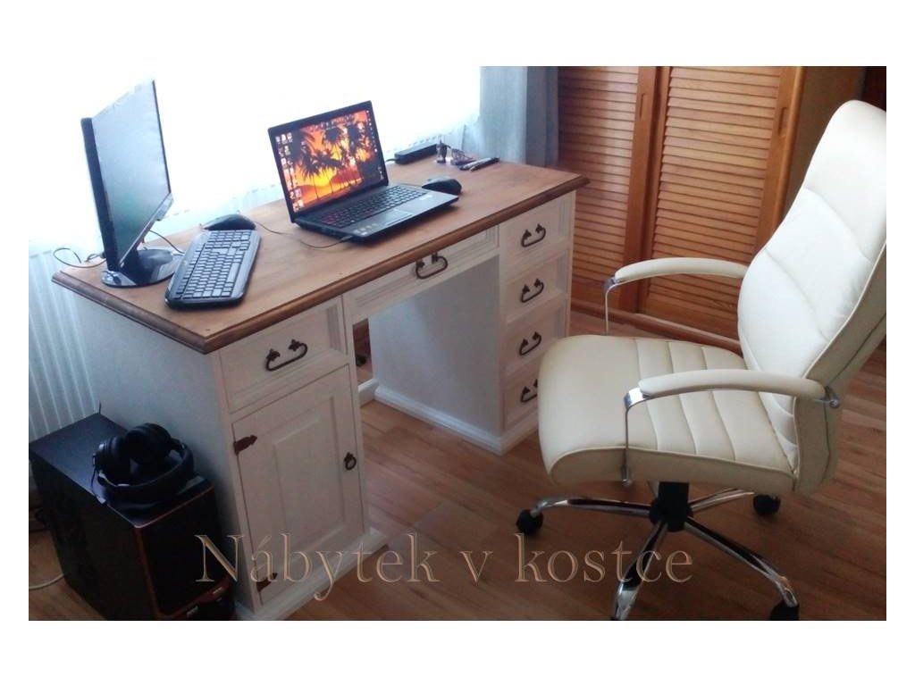 Písací stôl SWEET HOME BIR14 je pevný stôl vyrobený z masívneho borovicového dreva (zadná časť skriniek je z drevenej dyhy) a ošetrený bielou vodou riediteľnou farbou. Hnedé povrchy možno ošetriť voskom alebo lakom. Bočnice a boky zásuviek sú vyrobené z 2 cm masívneho dreva. Drážky na podbehy a horná 3 cm vysoká doska stola sú tiež vyrobené z masívneho dreva. Spodný podstavec (3 cm) je po celom obvode stola, teda aj medzi skrinkami vzadu.