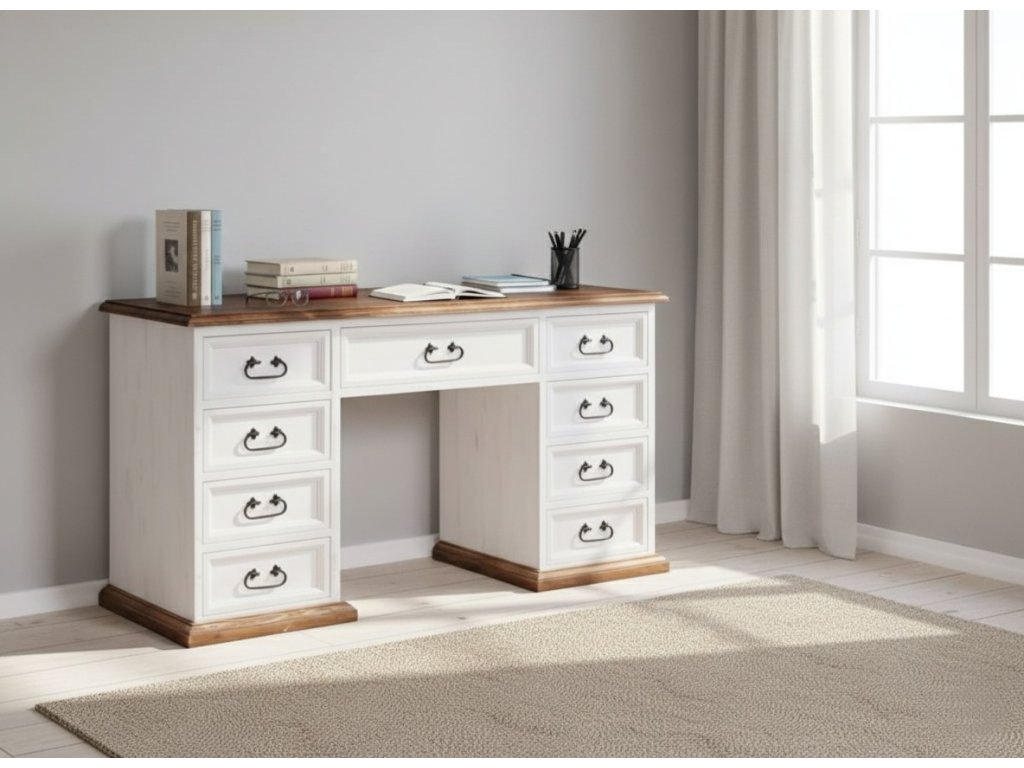 Písací stôl SWEET HOME BIR14 je pevný stôl vyrobený z masívneho borovicového dreva (zadná časť skriniek je z drevenej dyhy) a ošetrený bielou vodou riediteľnou farbou. Hnedé povrchy možno ošetriť voskom alebo lakom. Bočnice a boky zásuviek sú vyrobené z 2 cm masívneho dreva. Drážky na podbehy a horná 3 cm vysoká doska stola sú tiež vyrobené z masívneho dreva. Spodný podstavec (3 cm) je po celom obvode stola, teda aj medzi skrinkami vzadu.
