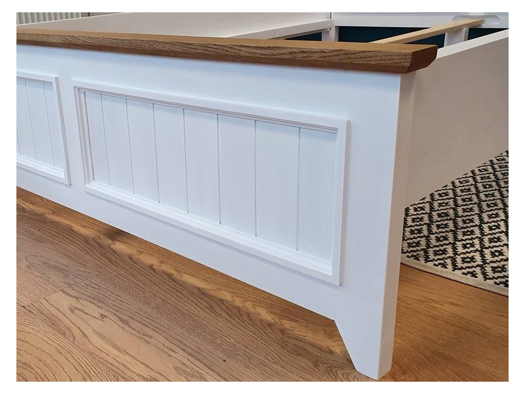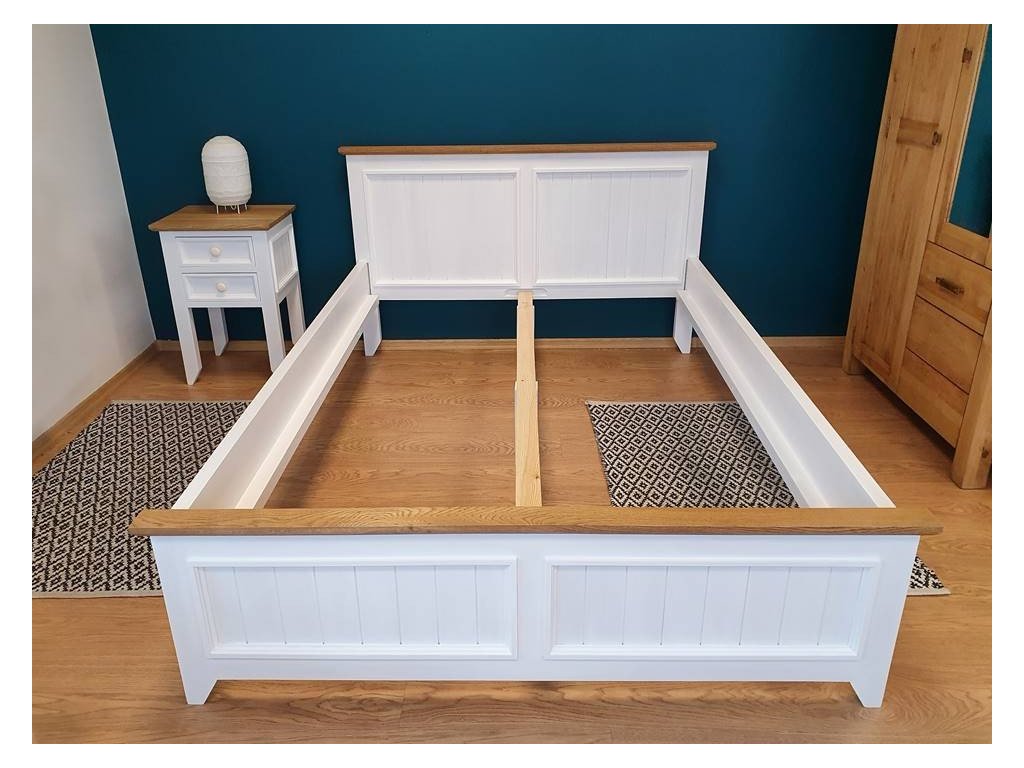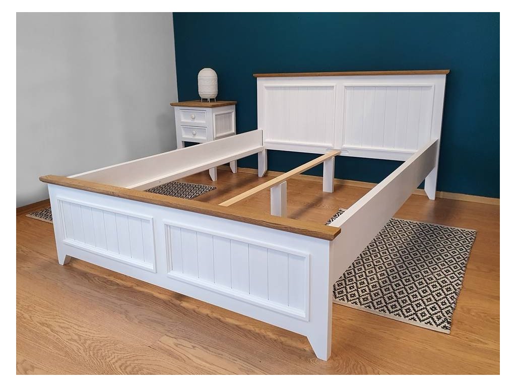 Masívna posteľ PROVENCE je kombináciou bukového a dubového dreva. Dubové drevo (vrchná časť) je ošetrené lakom a bukové drevo je ošetrené akrylovou farbou v sivej farbe.