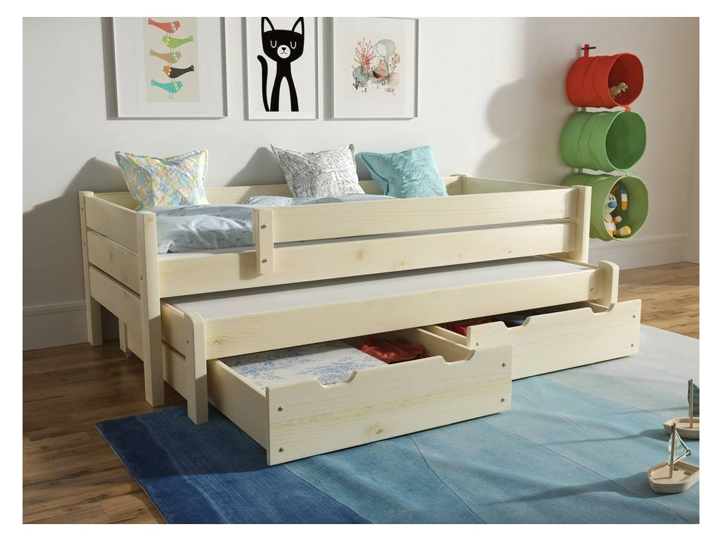 Posteľ ADRIAN s prístelkou a úložným priestorom má robustný a odolný rám a pevné nohy 4,5 x 9 cm. Oceňujeme dve hlboké a priestranné zásuvky na kolieskach, ktoré sa dajú úplne vytiahnuť spod postele.