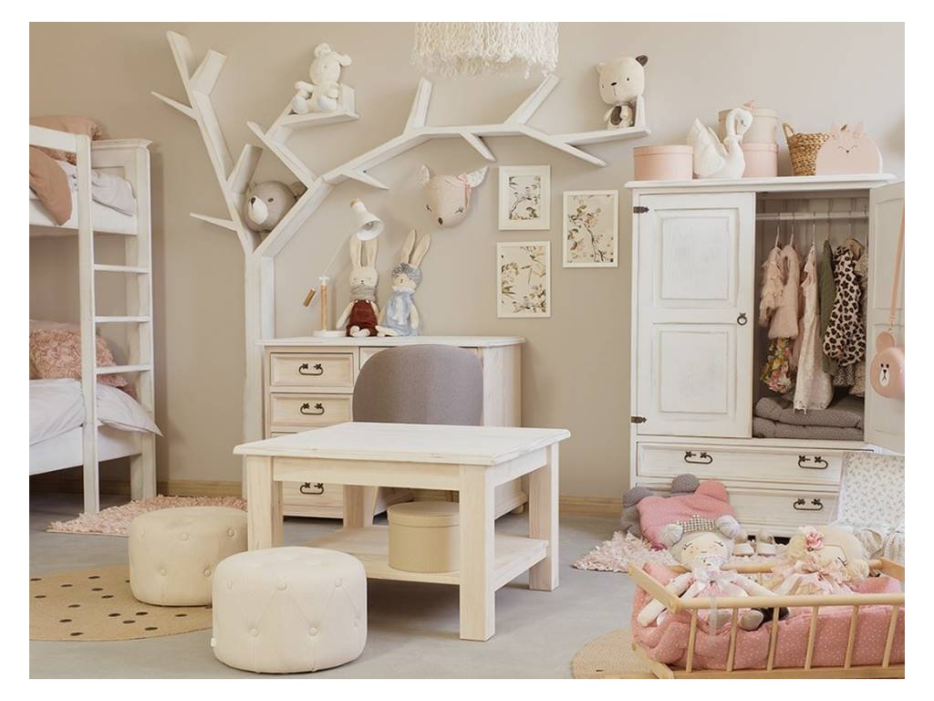 Nábytok WHITE HOME je vyrobený z masívneho borovicového dreva, len chrbty komôd sú vyrobené zo sololitu a chrbty písacích stolov z prírodnej dyhy. Zásuvky nemajú koľajničky, ale ich absencia nebráni plynulému vysúvaniu. Konečná povrchová úprava nábytku spočíva v ručnom nanášaní čistých prírodných voskov, vďaka ktorým je nábytok krásny a hodvábne jemný. Vosk sa na konzervovanie dreva používa už od stredoveku. Je to prírodný materiál, ktorý má priaznivé účinky na drevo a drevený nábytok. Efektný vzhľad nábytku dotvára štýlové kovanie a závesy v čiernej farbe.