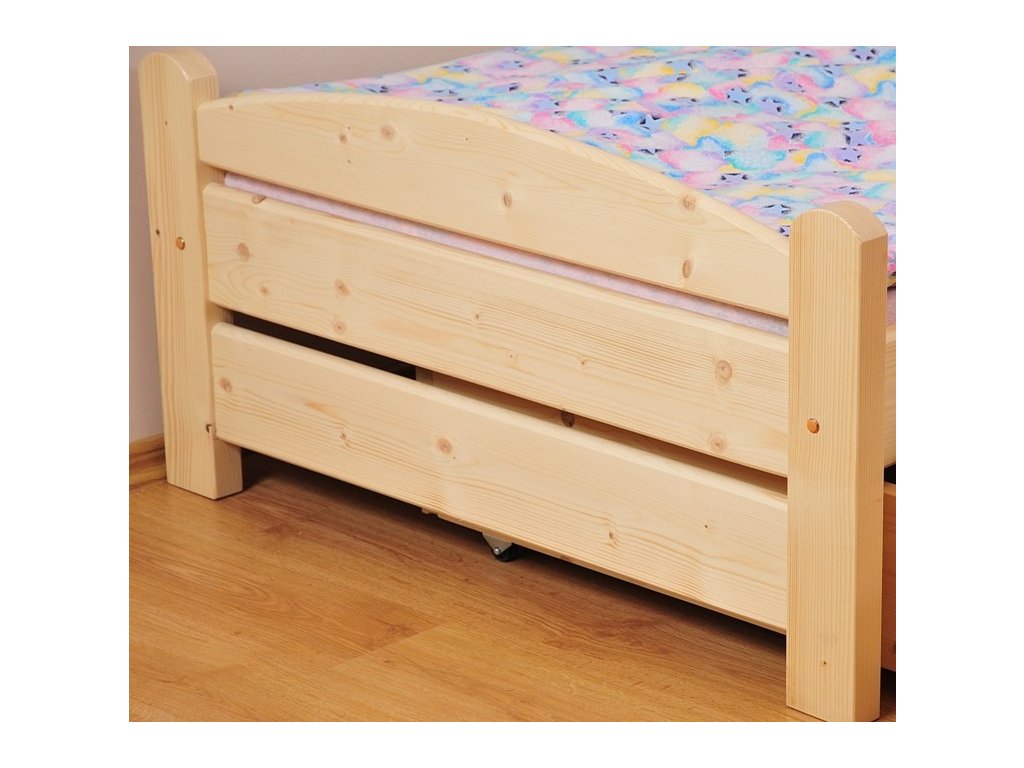 Posteľ z masívu Karla je kvalitná posteľ vyrobená z masívneho smrekového dreva, pevne spojená mosadznými skrutkami a drevenými kolíkmi. Posteľ obsahuje dve hlboké a priestranné zásuvky na kolieskach, ktoré sa dajú ľahko vysunúť spod postele. Zásuvky súideálne na uloženie posteľnej bielizne alebo hračiek pre deti. Posteľ má pevnú a odolnú konštrukciu a masívne nohy (4,5 x 9 cm). Zaoblené hrany sú tiež cenené ako ochrana pred možným poranením.. Posteľ obsahuje 13 lamelových roštov. Matrac nie je súčasťou postele. Posteľ Karla je k dispozícii v prírodnom odtieni.