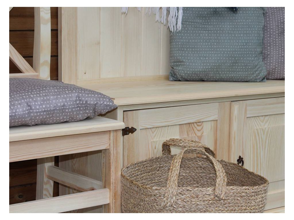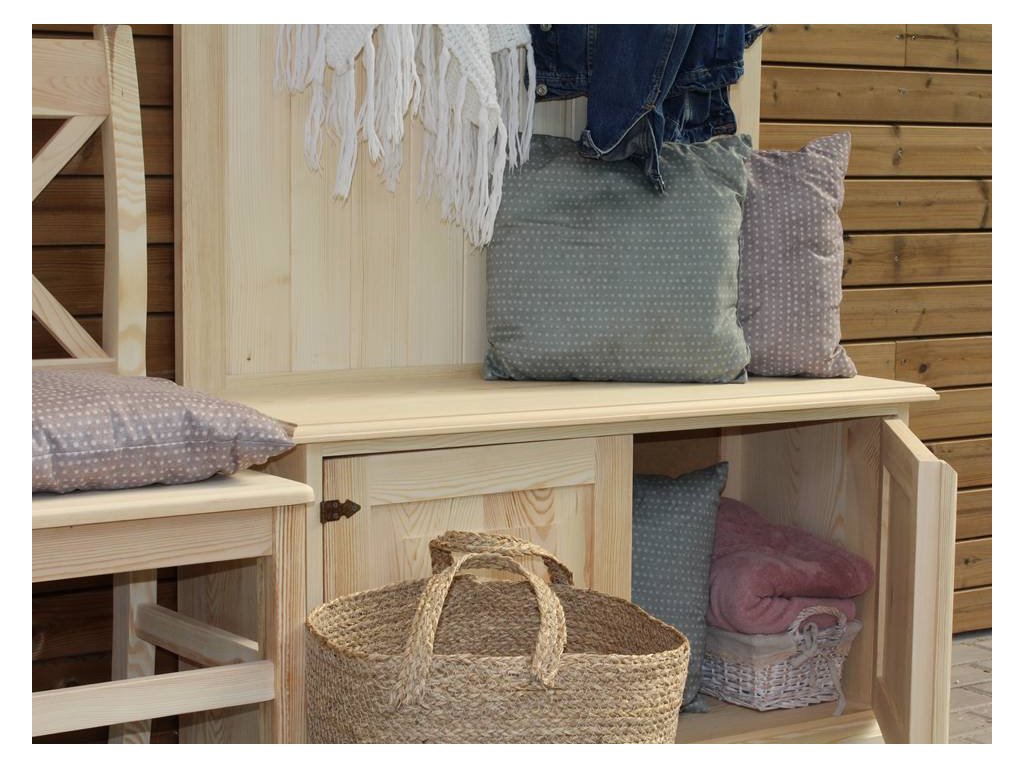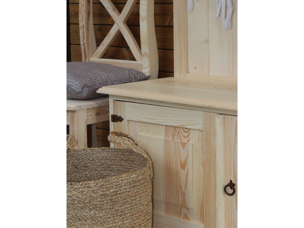 Rustikální předsíňová stěna MEXICANA je celomasivní nábytek do předsíně vyrobena z borovicového masivního dřeva (jen zadní stranu spodní skříňky tvoří sololit). Ošetřena je přírodním voskem. Vnitřní prostory spodní skříňky nejsou ošetřeny voskem, jsou ošetřeny pouze bezbarvým nátěrem tak, aby co nejvíce vynikla krása přírodního dřeva.