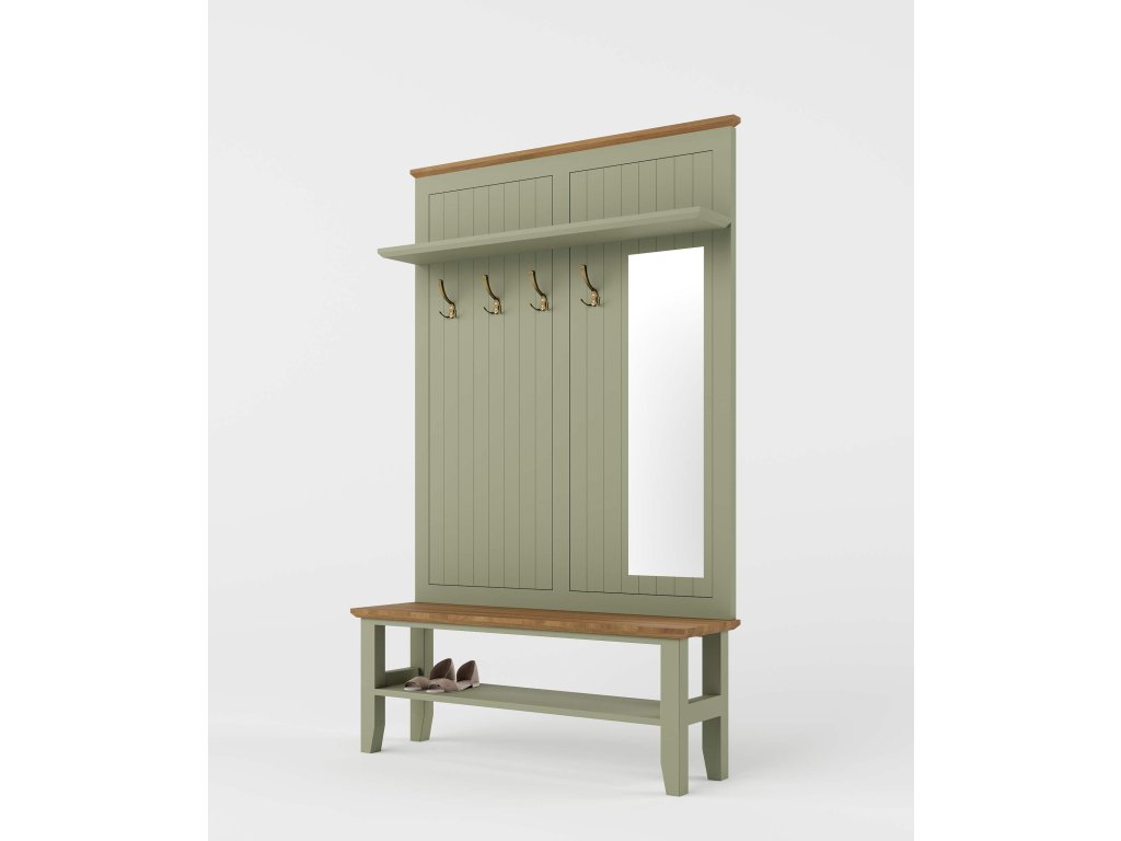 Masivní předsíňová stěna PROVENCE je věšáková stěna vyrobená z masivního bukového dřeva, které je ošetřeno akrylovou barvou v olivovém odstínu, a z masivního dubového dřeva (horní deska), které je ošetřeno lakem. Díky spojení těchto dvou druhů masivního dřeva získala masivní stěna jedinečný vzhled, který zdokonalí Vaši předsíň.