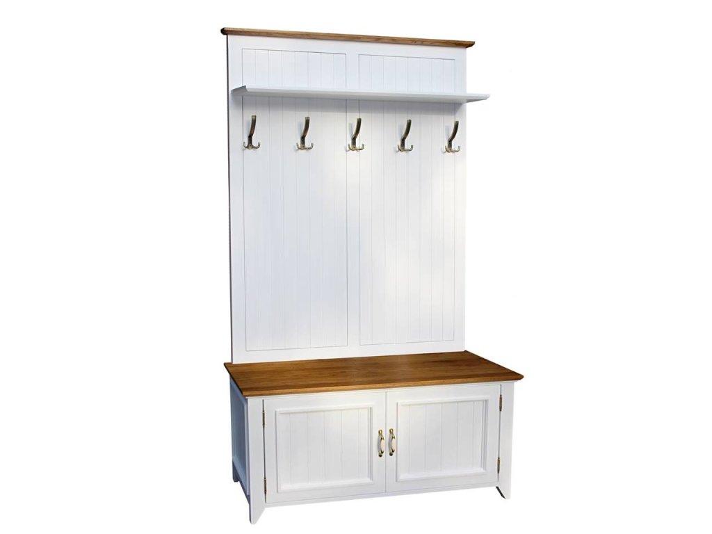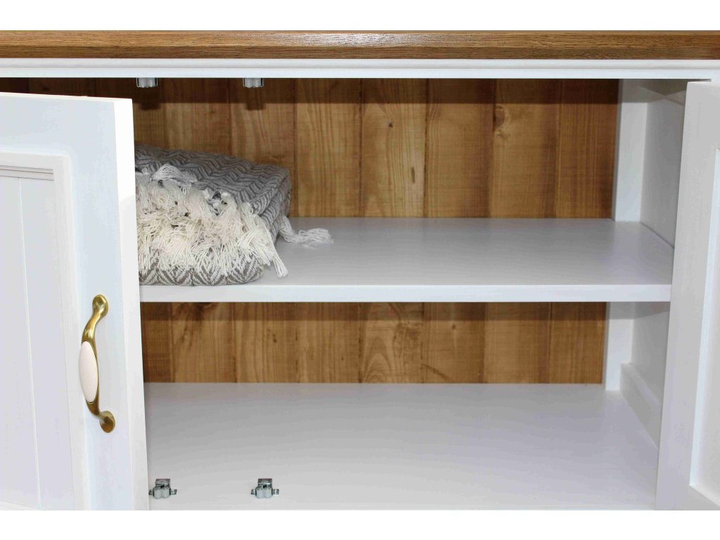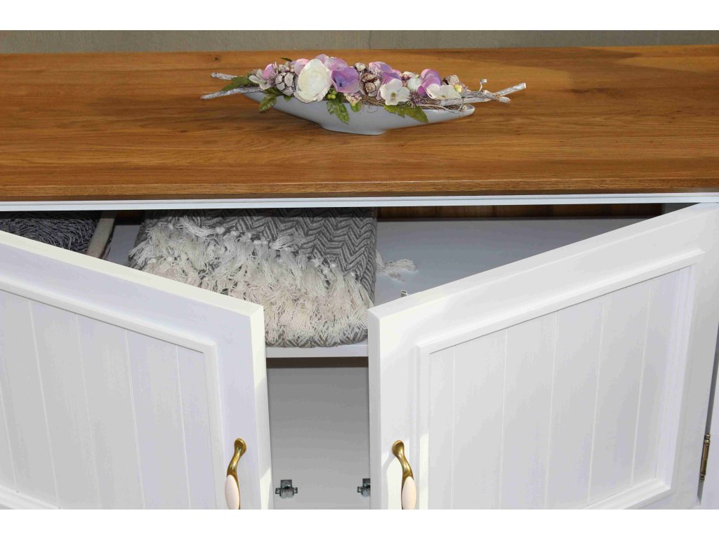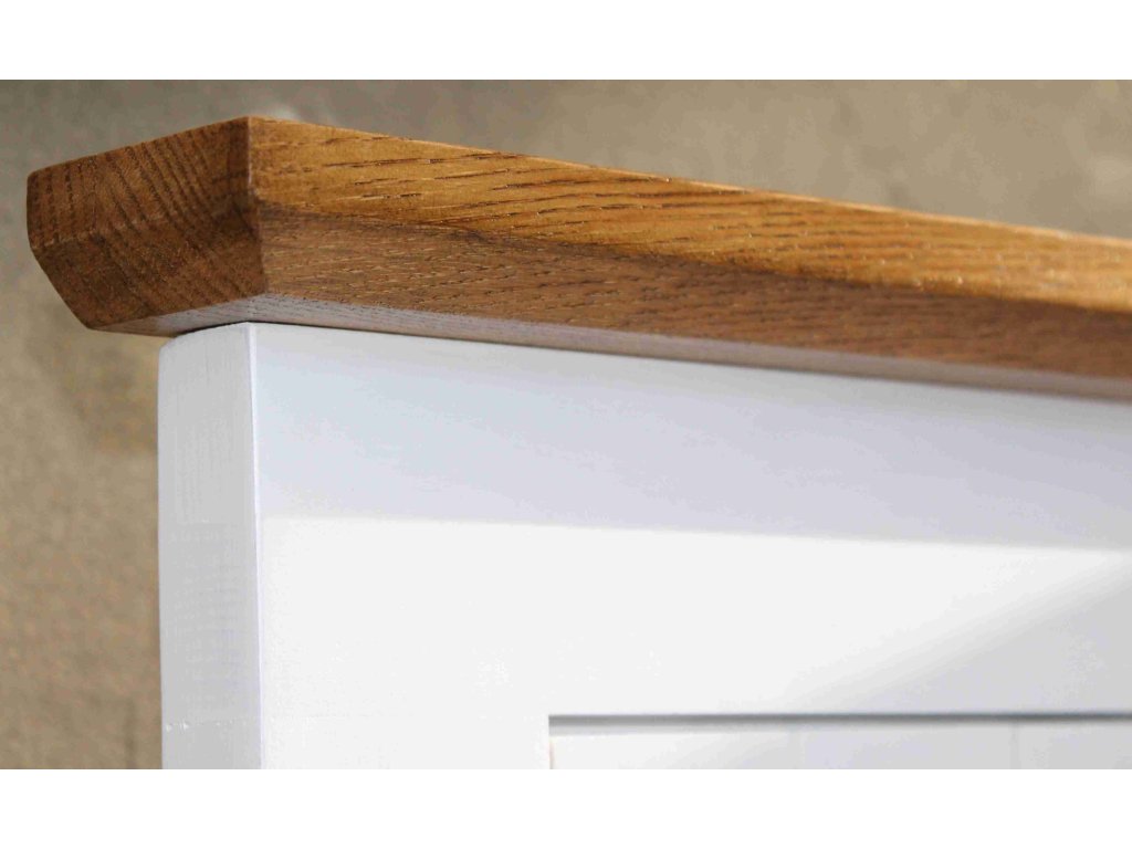 Masivní předsíňová stěna PROVENCE je spojením bukového a dubového dřeva. Dubové dřevo (horní deska) je ošetřeno lakem a bukové dřevo je ošetřeno akrylovou barvou v bílé barvě.