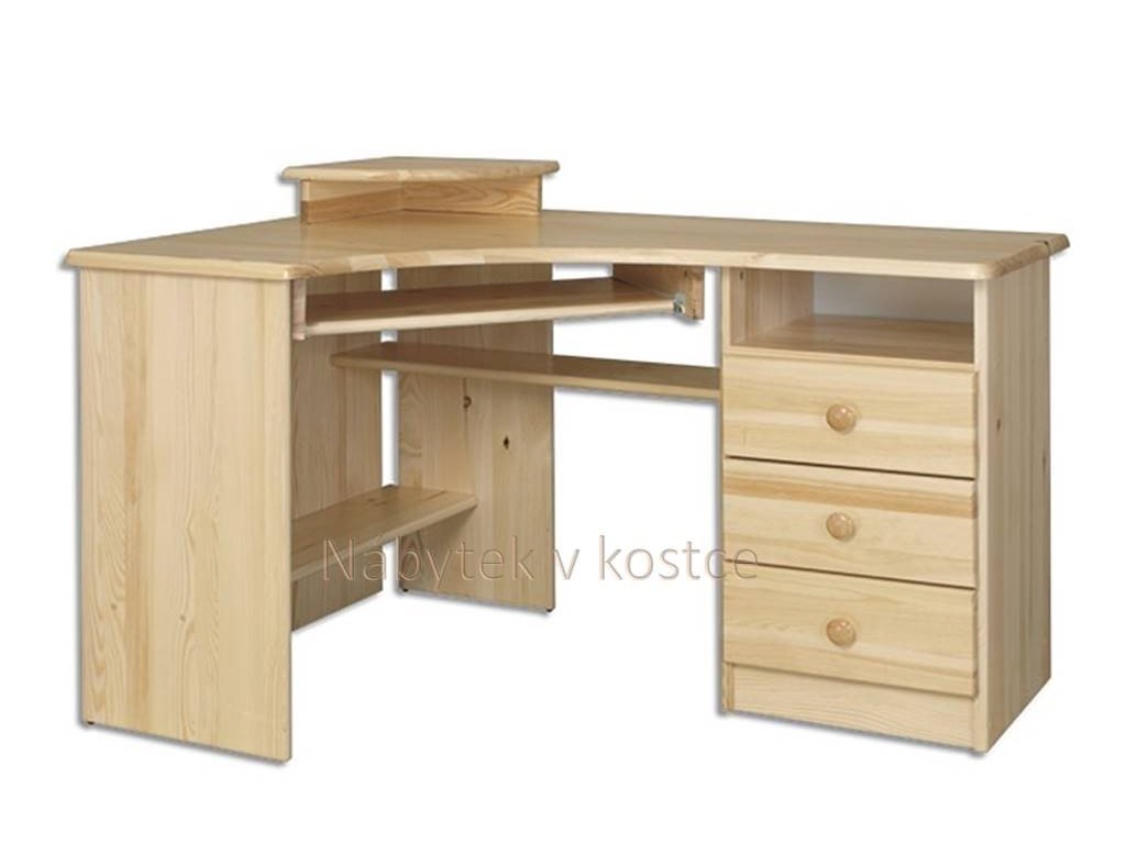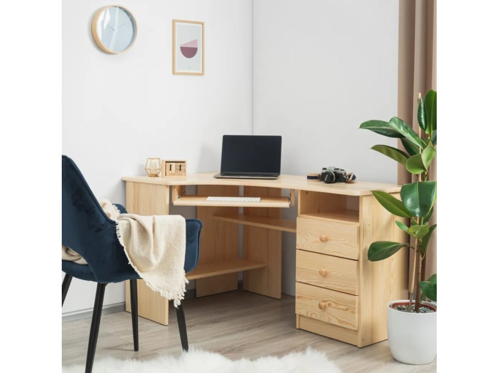 Rohový stôl je vybavený výsuvnou doskou na klávesnicu, tromi praktickými zásuvkami na kolieskach, voľnou policou a stojanom na monitor. Stôl sa vyznačuje dôkladným spracovaním, vynikajúcou stabilitou a dlhou životnosťou. Pre tento stôl odporúčame stoličky z borovice.