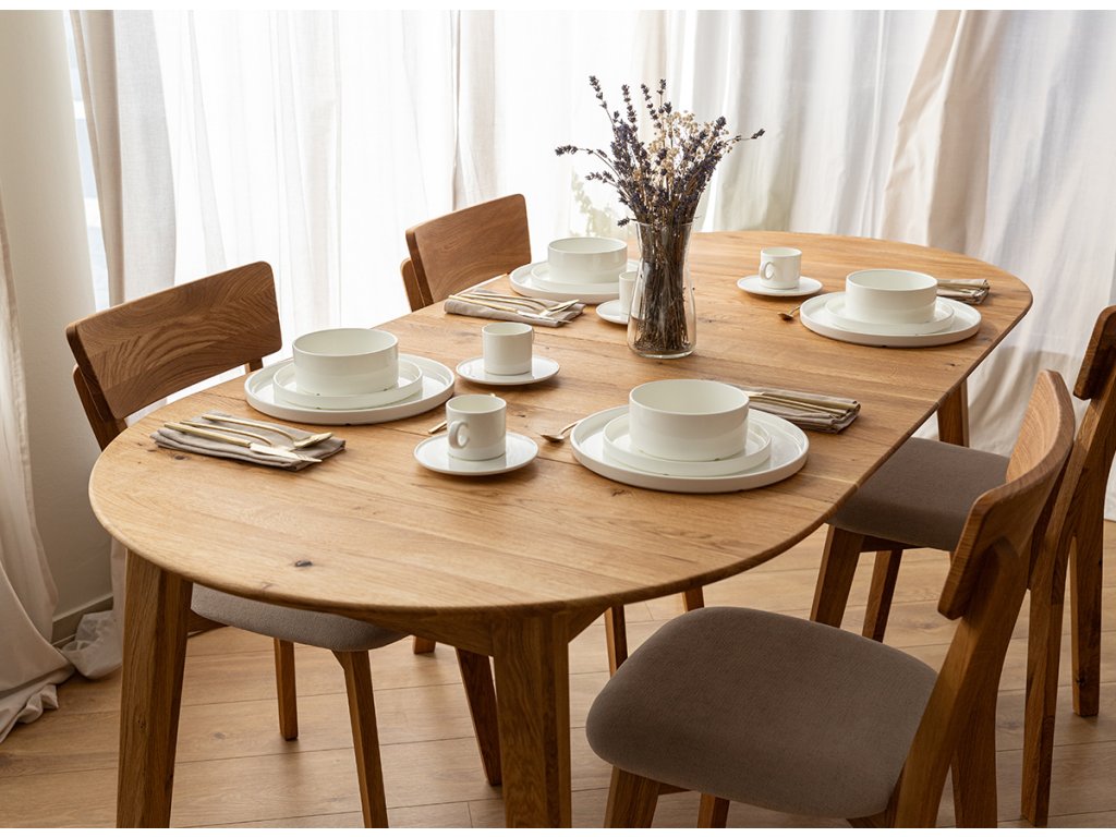 Materiál, z ktorého bol stôl vyrobený, masívne dubové drevo prvotriednej kvality, sa vyznačuje vysokou pevnosťou, trvanlivosťou a odolnosťou voči poškodeniu aj v prípade nedokonalej údržby. Jedálenský stôl vás preto bude tešiť svojou sviežou krásou ešte mnoho rokov po zakúpení bez toho, aby ste sa museli obávať známok nadmerného používania. Dômyselná konštrukcia zaručuje dokonalú stabilitu.