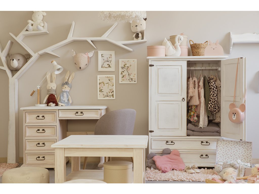 Nábytok WHITE HOME je vyrobený z masívneho borovicového dreva, len chrbty komôd sú vyrobené zo sololitu a chrbty písacích stolov z prírodnej dyhy. Zásuvky nemajú koľajničky, ale ich absencia nebráni plynulému vysúvaniu. Konečná povrchová úprava nábytku spočíva v ručnom nanášaní čistých prírodných voskov, vďaka ktorým je nábytok krásny a hodvábne jemný. Vosk sa na konzervovanie dreva používa už od stredoveku. Je to prírodný materiál, ktorý má priaznivé účinky na drevo a drevený nábytok. Efektný vzhľad nábytku dotvára štýlové kovanie a závesy v čiernej farbe.